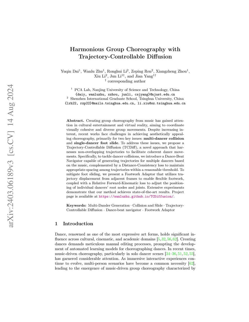 Creating group choreography from music is crucial in cultural entertainment and virtual reality, with a focus on generating harmonious movements. Despite growing interest, recent approaches often struggle with two major challenges: multi-dancer collisions and single-dancer foot sliding. To address these challenges, we propose a Trajectory-Controllable Diffusion (TCDiff) framework, which leverages non-overlapping trajectories to ensure coherent and aesthetically pleasing dance movements. To mitigate collisions, we introduce a Dance-Trajectory Navigator that generates collision-free trajectories for multiple dancers, utilizing a distance-consistency loss to maintain optimal spacing. Furthermore, to reduce foot sliding, we present a footwork adaptor that adjusts trajectory displacement between frames, supported by a relative forward-kinematic loss to further reinforce the correlation between movements and trajectories. Experiments demonstrate our method's superiority.