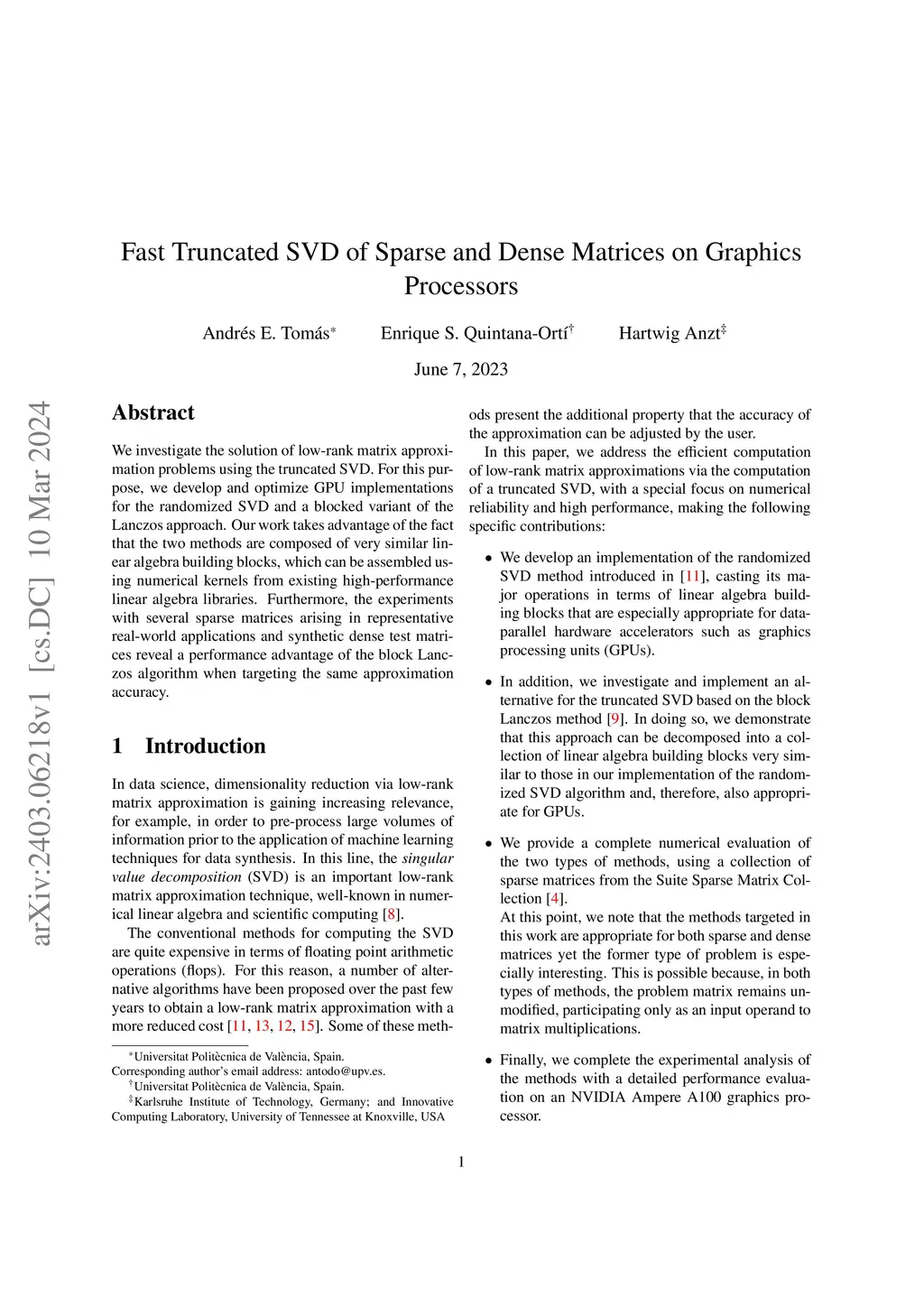 Fast Truncated SVD of Sparse and Dense Matrices on Graphics Processors