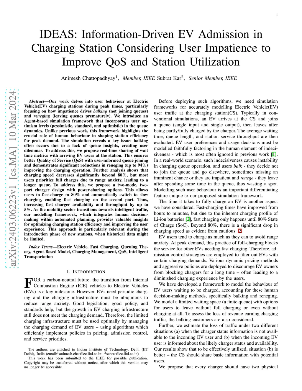 Our work delves into user behaviour at Electric Vehicle(EV) charging stations during peak times, particularly focusing on how impatience drives balking (not joining queues) and reneging (leaving queues prematurely). We introduce an Agent-based simulation framework that incorporates user optimism levels (pessimistic, standard, and optimistic) in the queue dynamics. Unlike previous work, this framework highlights the crucial role of human behaviour in shaping station efficiency for peak demand. The simulation reveals a key issue: balking often occurs due to a lack of queue insights, creating user dilemmas. To address this, we propose real-time sharing of wait time metrics with arriving EV users at the station. This ensures better Quality of Service (QoS) with user-informed queue joining and demonstrates significant reductions in reneging (up to 94%) improving the charging operation. Further analysis shows that charging speed decreases significantly beyond 80%, but most users prioritize full charges due to range anxiety, leading to a longer queue. To address this, we propose a two-mode, two-port charger design with power-sharing options. This allows users to fast-charge to 80% and automatically switch to slow charging, enabling fast charging on the second port. Thus, increasing fast charger availability and throughput by up to 5%. As the mobility sector transitions towards intelligent traffic, our modelling framework, which integrates human decision-making within automated planning, provides valuable insights for optimizing charging station efficiency and improving the user experience. This approach is particularly relevant during the introduction phase of new stations, when historical data might be limited.