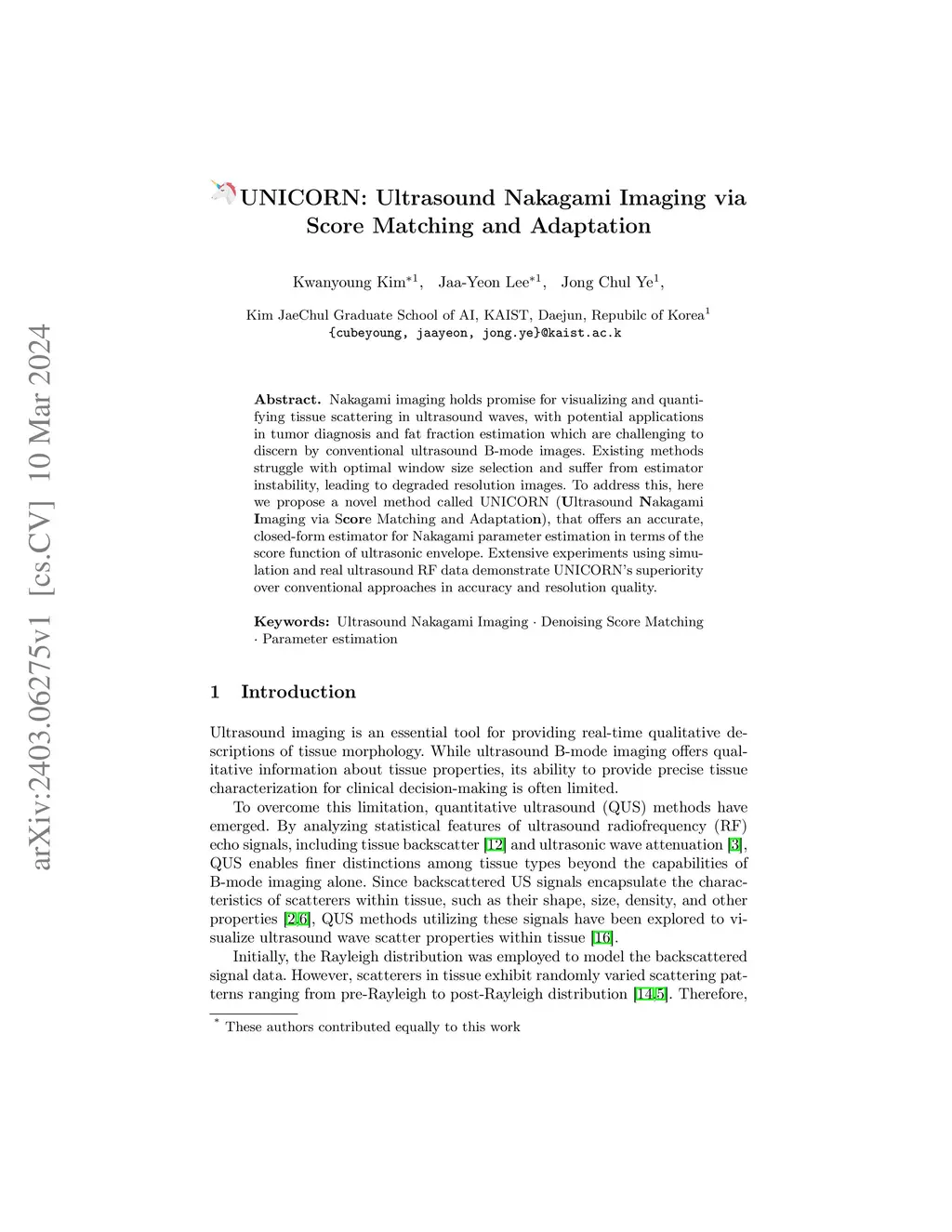 Nakagami imaging holds promise for visualizing and quantifying tissue scattering in ultrasound waves, with potential applications in tumor diagnosis and fat fraction estimation which are challenging to discern by conventional ultrasound B-mode images. Existing methods struggle with optimal window size selection and suffer from estimator instability, leading to degraded resolution images. To address this, here we propose a novel method called UNICORN (Ultrasound Nakagami Imaging via Score Matching and Adaptation), that offers an accurate, closed-form estimator for Nakagami parameter estimation in terms of the score function of ultrasonic envelope. Extensive experiments using simulation and real ultrasound RF data demonstrate UNICORN's superiority over conventional approaches in accuracy and resolution quality.