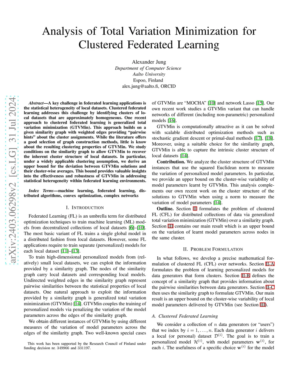 A key challenge in federated learning applications is the statistical heterogeneity of local datasets. Clustered federated learning addresses this challenge by identifying clusters of local datasets that are approximately homogeneous. One recent approach to clustered federated learning is generalized total variation minimization (GTVMin). This approach requires a similarity graph which can be obtained by domain expertise or in a data-driven fashion via graph learning techniques. Under a widely applicable clustering assumption, we derive an upper bound the deviation between GTVMin solutions and their cluster-wise averages. This bound provides valuable insights into the effectiveness and robustness of GTVMin in addressing statistical heterogeneity within federated learning environments.