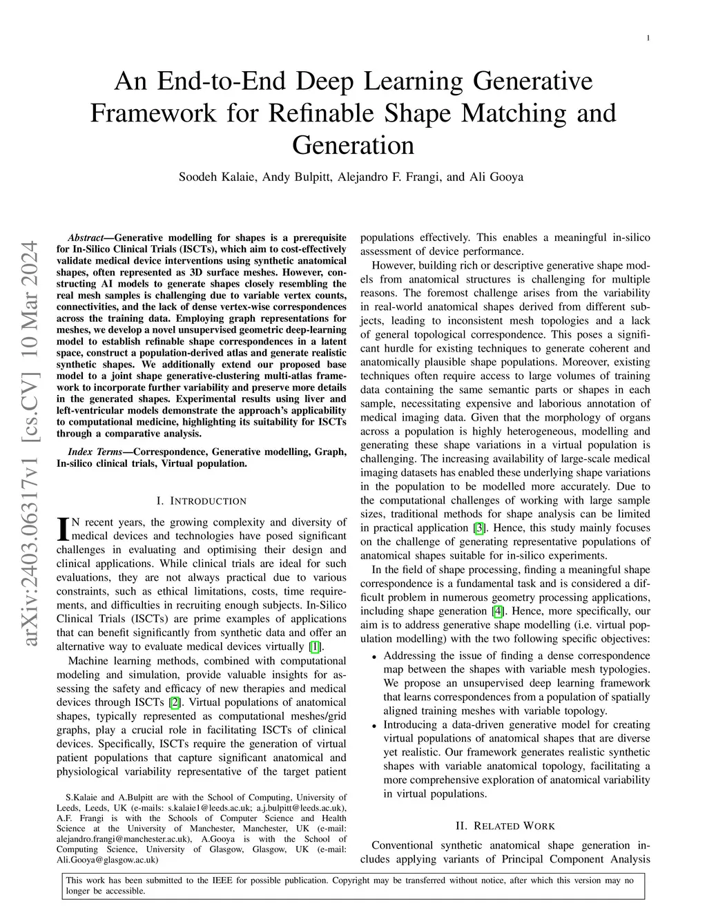 Generative modelling for shapes is a prerequisite for In-Silico Clinical Trials (ISCTs), which aim to cost-effectively validate medical device interventions using synthetic anatomical shapes, often represented as 3D surface meshes. However, constructing AI models to generate shapes closely resembling the real mesh samples is challenging due to variable vertex counts, connectivities, and the lack of dense vertex-wise correspondences across the training data. Employing graph representations for meshes, we develop a novel unsupervised geometric deep-learning model to establish refinable shape correspondences in a latent space, construct a population-derived atlas and generate realistic synthetic shapes. We additionally extend our proposed base model to a joint shape generative-clustering multi-atlas framework to incorporate further variability and preserve more details in the generated shapes. Experimental results using liver and left-ventricular models demonstrate the approach's applicability to computational medicine, highlighting its suitability for ISCTs through a comparative analysis.