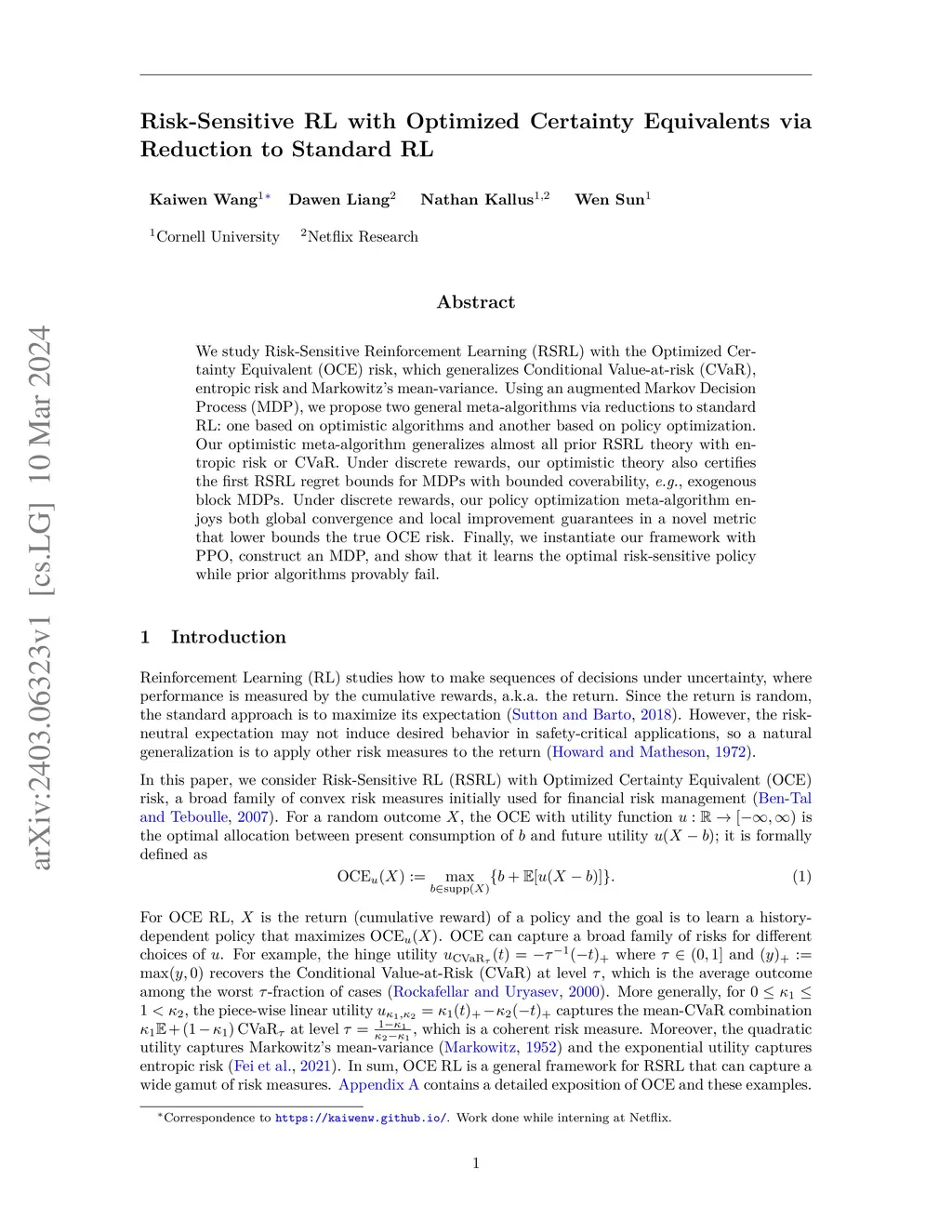 We study risk-sensitive RL where the goal is learn a history-dependent policy that optimizes some risk measure of cumulative rewards. We consider a family of risks called the optimized certainty equivalents (OCE), which captures important risk measures such as conditional value-at-risk (CVaR), entropic risk and Markowitz's mean-variance. In this setting, we propose two meta-algorithms: one grounded in optimism and another based on policy gradients, both of which can leverage the broad suite of risk-neutral RL algorithms in an augmented Markov Decision Process (MDP). Via a reductions approach, we leverage theory for risk-neutral RL to establish novel OCE bounds in complex, rich-observation MDPs. For the optimism-based algorithm, we prove bounds that generalize prior results in CVaR RL and that provide the first risk-sensitive bounds for exogenous block MDPs. For the gradient-based algorithm, we establish both monotone improvement and global convergence guarantees under a discrete reward assumption. Finally, we empirically show that our algorithms learn the optimal history-dependent policy in a proof-of-concept MDP, where all Markovian policies provably fail.
