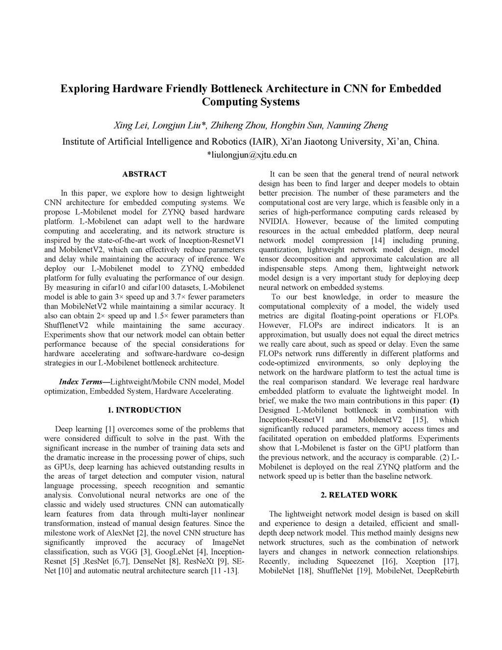 In this paper, we explore how to design lightweight CNN architecture for embedded computing systems. We propose L-Mobilenet model for ZYNQ based hardware platform. L-Mobilenet can adapt well to the hardware computing and accelerating, and its network structure is inspired by the state-of-the-art work of Inception-ResnetV1 and MobilenetV2, which can effectively reduce parameters and delay while maintaining the accuracy of inference. We deploy our L-Mobilenet model to ZYNQ embedded platform for fully evaluating the performance of our design. By measuring in cifar10 and cifar100 datasets, L-Mobilenet model is able to gain 3x speed up and 3.7x fewer parameters than MobileNetV2 while maintaining a similar accuracy. It also can obtain 2x speed up and 1.5x fewer parameters than ShufflenetV2 while maintaining the same accuracy. Experiments show that our network model can obtain better performance because of the special considerations for hardware accelerating and software-hardware co-design strategies in our L-Mobilenet bottleneck architecture.