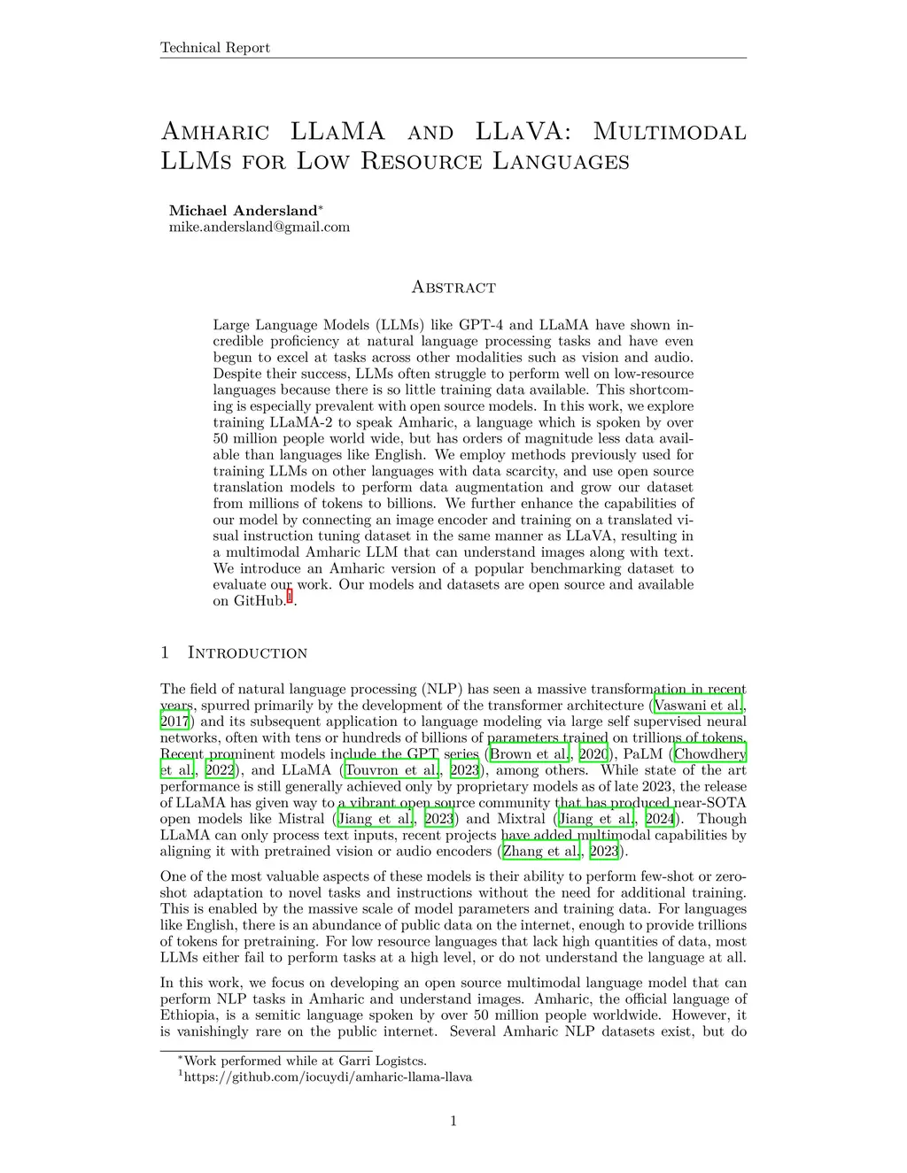 Large Language Models (LLMs) like GPT-4 and LLaMA have shown incredible proficiency at natural language processing tasks and have even begun to excel at tasks across other modalities such as vision and audio. Despite their success, LLMs often struggle to perform well on low-resource languages because there is so little training data available. This shortcoming is especially prevalent with open source models. In this work, we explore training LLaMA-2 to speak Amharic, a language which is spoken by over 50 million people world wide, but has orders of magnitude less data available than languages like English. We employ methods previously used for training LLMs on other languages with data scarcity, and use open source translation models to perform data augmentation and grow our dataset from millions of tokens to billions. We further enhance the capabilities of our model by connecting an image encoder and training on a translated visual instruction tuning dataset in the same manner as LLaVA, resulting in a multimodal Amharic LLM that can understand images along with text. We introduce an Amharic version of a popular benchmarking dataset to evaluate our work. Our models and dataset are open sourced and available on GitHub.