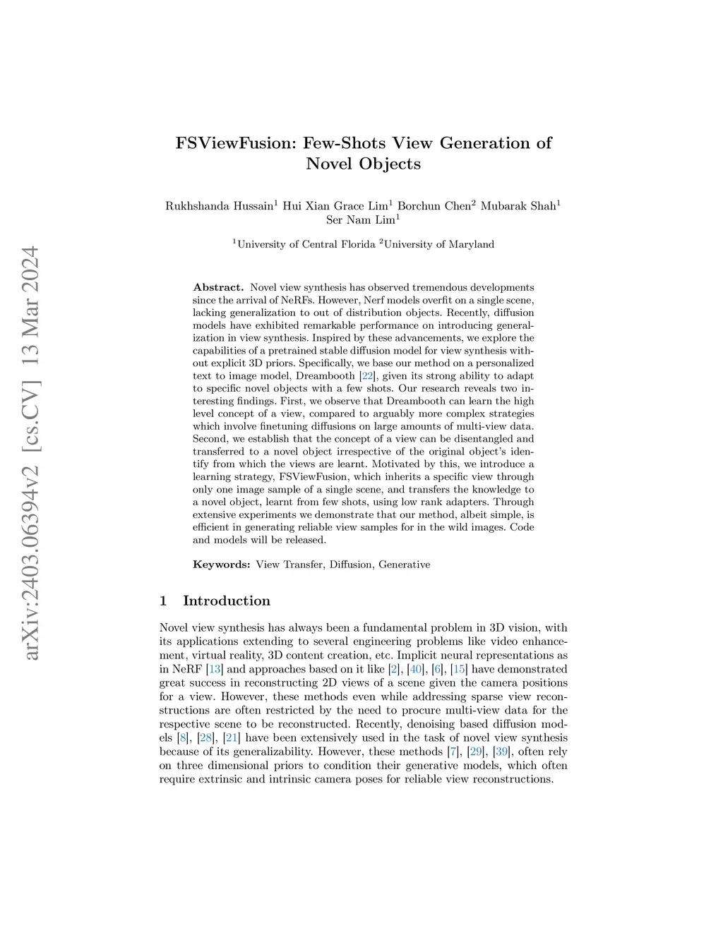 Novel view synthesis has observed tremendous developments since the arrival of NeRFs. However, Nerf models overfit on a single scene, lacking generalization to out of distribution objects. Recently, diffusion models have exhibited remarkable performance on introducing generalization in view synthesis. Inspired by these advancements, we explore the capabilities of a pretrained stable diffusion model for view synthesis without explicit 3D priors. Specifically, we base our method on a personalized text to image model, Dreambooth, given its strong ability to adapt to specific novel objects with a few shots. Our research reveals two interesting findings. First, we observe that Dreambooth can learn the high level concept of a view, compared to arguably more complex strategies which involve finetuning diffusions on large amounts of multi-view data. Second, we establish that the concept of a view can be disentangled and transferred to a novel object irrespective of the original object's identify from which the views are learnt. Motivated by this, we introduce a learning strategy, FSViewFusion, which inherits a specific view through only one image sample of a single scene, and transfers the knowledge to a novel object, learnt from few shots, using low rank adapters. Through extensive experiments we demonstrate that our method, albeit simple, is efficient in generating reliable view samples for in the wild images. Code and models will be released.