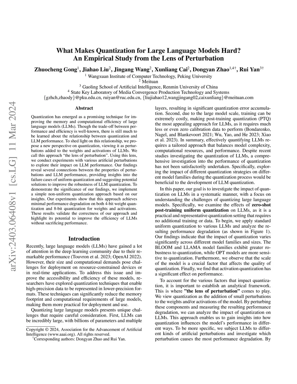 Quantization has emerged as a promising technique for improving the memory and computational efficiency of large language models (LLMs). Though the trade-off between performance and efficiency is well-known, there is still much to be learned about the relationship between quantization and LLM performance. To shed light on this relationship, we propose a new perspective on quantization, viewing it as perturbations added to the weights and activations of LLMs. We call this approach "the lens of perturbation". Using this lens, we conduct experiments with various artificial perturbations to explore their impact on LLM performance. Our findings reveal several connections between the properties of perturbations and LLM performance, providing insights into the failure cases of uniform quantization and suggesting potential solutions to improve the robustness of LLM quantization. To demonstrate the significance of our findings, we implement a simple non-uniform quantization approach based on our insights. Our experiments show that this approach achieves minimal performance degradation on both 4-bit weight quantization and 8-bit quantization for weights and activations. These results validate the correctness of our approach and highlight its potential to improve the efficiency of LLMs without sacrificing performance.