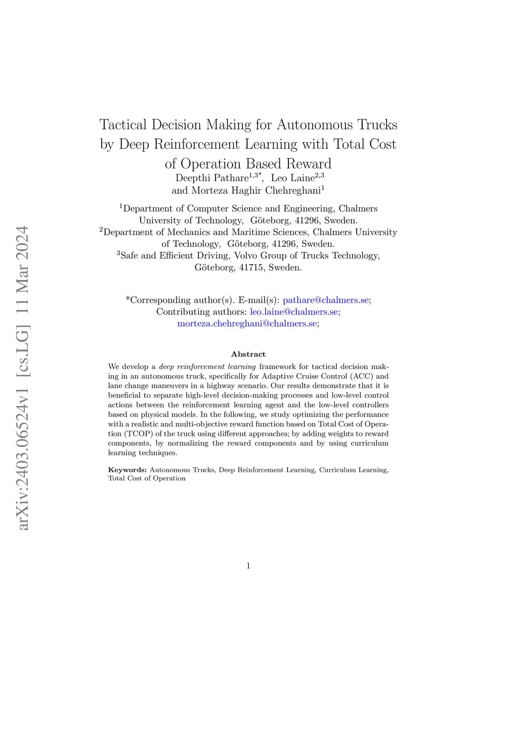 We develop a deep reinforcement learning framework for tactical decision making in an autonomous truck, specifically for Adaptive Cruise Control (ACC) and lane change maneuvers in a highway scenario. Our results demonstrate that it is beneficial to separate high-level decision-making processes and low-level control actions between the reinforcement learning agent and the low-level controllers based on physical models. In the following, we study optimizing the performance with a realistic and multi-objective reward function based on Total Cost of Operation (TCOP) of the truck using different approaches; by adding weights to reward components, by normalizing the reward components and by using curriculum learning techniques.