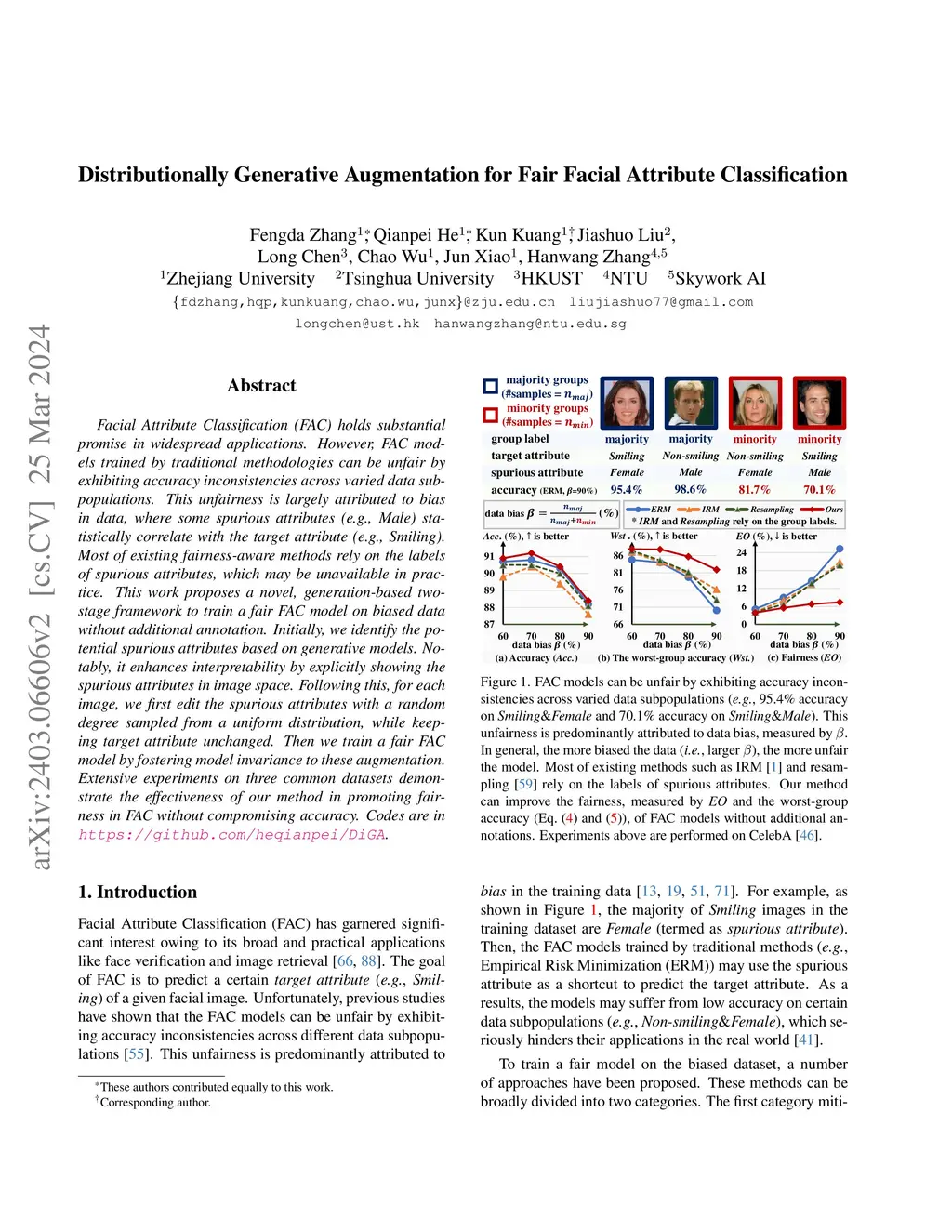 Facial Attribute Classification (FAC) holds substantial promise in widespread applications. However, FAC models trained by traditional methodologies can be unfair by exhibiting accuracy inconsistencies across varied data subpopulations. This unfairness is largely attributed to bias in data, where some spurious attributes (e.g., Male) statistically correlate with the target attribute (e.g., Smiling). Most of existing fairness-aware methods rely on the labels of spurious attributes, which may be unavailable in practice. This work proposes a novel, generation-based two-stage framework to train a fair FAC model on biased data without additional annotation. Initially, we identify the potential spurious attributes based on generative models. Notably, it enhances interpretability by explicitly showing the spurious attributes in image space. Following this, for each image, we first edit the spurious attributes with a random degree sampled from a uniform distribution, while keeping target attribute unchanged. Then we train a fair FAC model by fostering model invariance to these augmentation. Extensive experiments on three common datasets demonstrate the effectiveness of our method in promoting fairness in FAC without compromising accuracy. Codes are in https://github.com/heqianpei/DiGA.