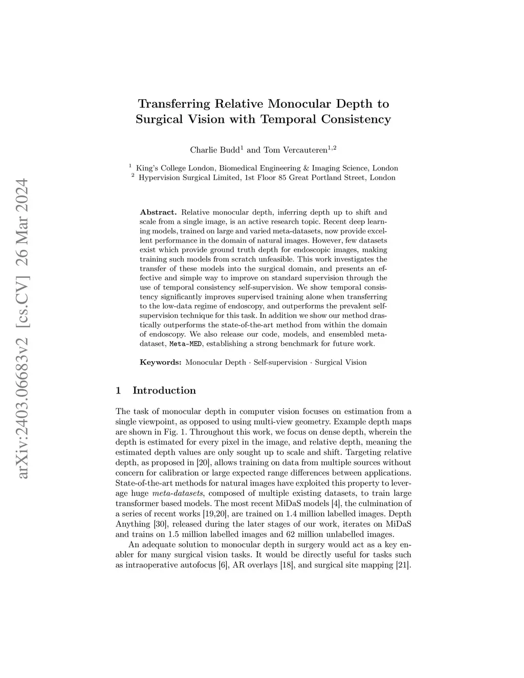 Relative monocular depth, inferring depth up to shift and scale from a single image, is an active research topic. Recent deep learning models, trained on large and varied meta-datasets, now provide excellent performance in the domain of natural images. However, few datasets exist which provide ground truth depth for endoscopic images, making training such models from scratch unfeasible. This work investigates the transfer of these models into the surgical domain, and presents an effective and simple way to improve on standard supervision through the use of temporal consistency self-supervision. We show temporal consistency significantly improves supervised training alone when transferring to the low-data regime of endoscopy, and outperforms the prevalent self-supervision technique for this task. In addition we show our method drastically outperforms the state-of-the-art method from within the domain of endoscopy. We also release our code, model and ensembled meta-dataset, Meta-MED, establishing a strong benchmark for future work.
