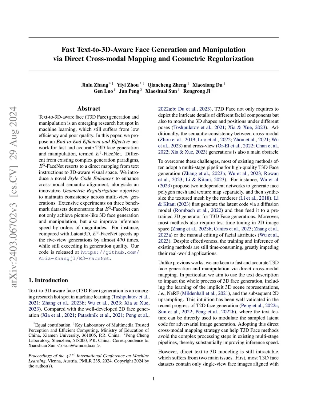 Text-to-3D-aware face (T3D Face) generation and manipulation is an emerging research hot spot in machine learning, which still suffers from low efficiency and poor quality. In this paper, we propose an End-to-End Efficient and Effective network for fast and accurate T3D face generation and manipulation, termed -FaceNet. Different from existing complex generation paradigms, -FaceNet resorts to a direct mapping from text instructions to 3D-aware visual space. We introduce a novel Style Code Enhancer to enhance cross-modal semantic alignment, alongside an innovative Geometric Regularization objective to maintain consistency across multi-view generations. Extensive experiments on three benchmark datasets demonstrate that -FaceNet can not only achieve picture-like 3D face generation and manipulation, but also improve inference speed by orders of magnitudes. For instance, compared with Latent3D, -FaceNet speeds up the five-view generations by almost 470 times, while still exceeding in generation quality. Our code is released at https://github.com/Aria-Zhangjl/E3-FaceNet.