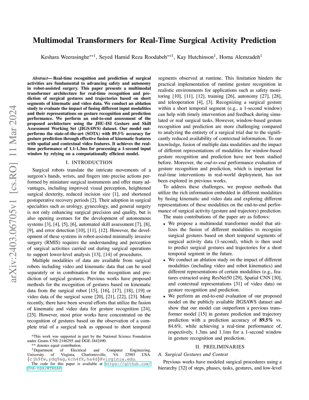 Real-time recognition and prediction of surgical activities are fundamental to advancing safety and autonomy in robot-assisted surgery. This paper presents a multimodal transformer architecture for real-time recognition and prediction of surgical gestures and trajectories based on short segments of kinematic and video data. We conduct an ablation study to evaluate the impact of fusing different input modalities and their representations on gesture recognition and prediction performance. We perform an end-to-end assessment of the proposed architecture using the JHU-ISI Gesture and Skill Assessment Working Set (JIGSAWS) dataset. Our model outperforms the state-of-the-art (SOTA) with 89.5\% accuracy for gesture prediction through effective fusion of kinematic features with spatial and contextual video features. It achieves the real-time performance of 1.1-1.3ms for processing a 1-second input window by relying on a computationally efficient model.