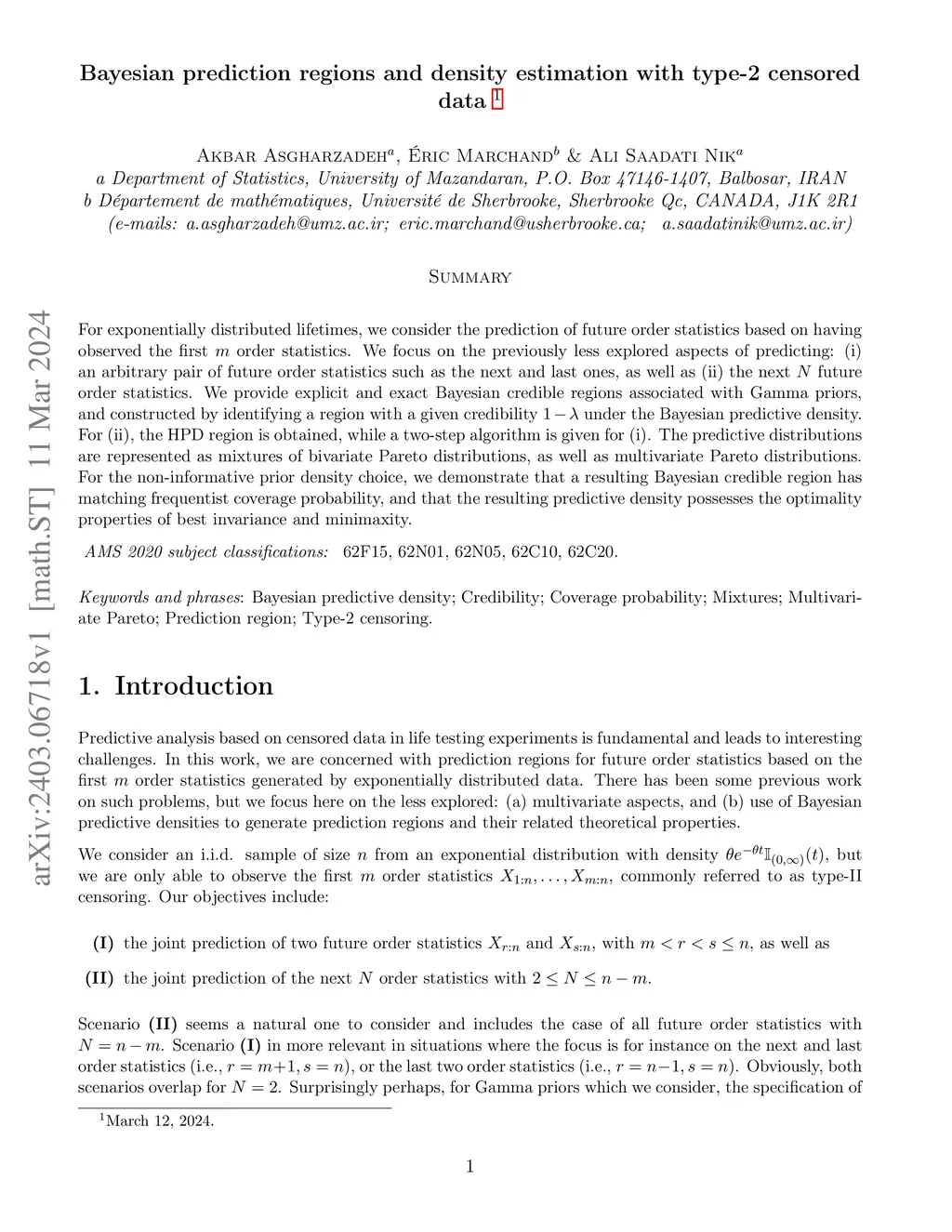 For exponentially distributed lifetimes, we consider the prediction of future order statistics based on having observed the first order statistics. We focus on the previously less explored aspects of predicting: (i) an arbitrary pair of future order statistics such as the next and last ones, as well as (ii) the next future order statistics. We provide explicit and exact Bayesian credible regions associated with Gamma priors, and constructed by identifying a region with a given credibility under the Bayesian predictive density. For (ii), the HPD region is obtained, while a two-step algorithm is given for (i). The predictive distributions are represented as mixtures of bivariate Pareto distributions, as well as multivariate Pareto distributions. For the non-informative prior density choice, we demonstrate that a resulting Bayesian credible region has matching frequentist coverage probability, and that the resulting predictive density possesses the optimality properties of best invariance and minimaxity.