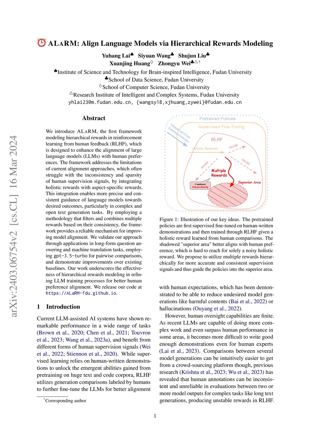 We introduce ALaRM, the first framework modeling hierarchical rewards in reinforcement learning from human feedback (RLHF), which is designed to enhance the alignment of large language models (LLMs) with human preferences. The framework addresses the limitations of current alignment approaches, which often struggle with the inconsistency and sparsity of human supervision signals, by integrating holistic rewards with aspect-specific rewards. This integration enables more precise and consistent guidance of language models towards desired outcomes, particularly in complex and open text generation tasks. By employing a methodology that filters and combines multiple rewards based on their consistency, the framework provides a reliable mechanism for improving model alignment. We validate our approach through applications in long-form question answering and machine translation tasks, employing gpt-3.5-turbo for pairwise comparisons, and demonstrate improvements over existing baselines. Our work underscores the effectiveness of hierarchical rewards modeling in refining LLM training processes for better human preference alignment. We release our code at https://ALaRM-fdu.github.io.