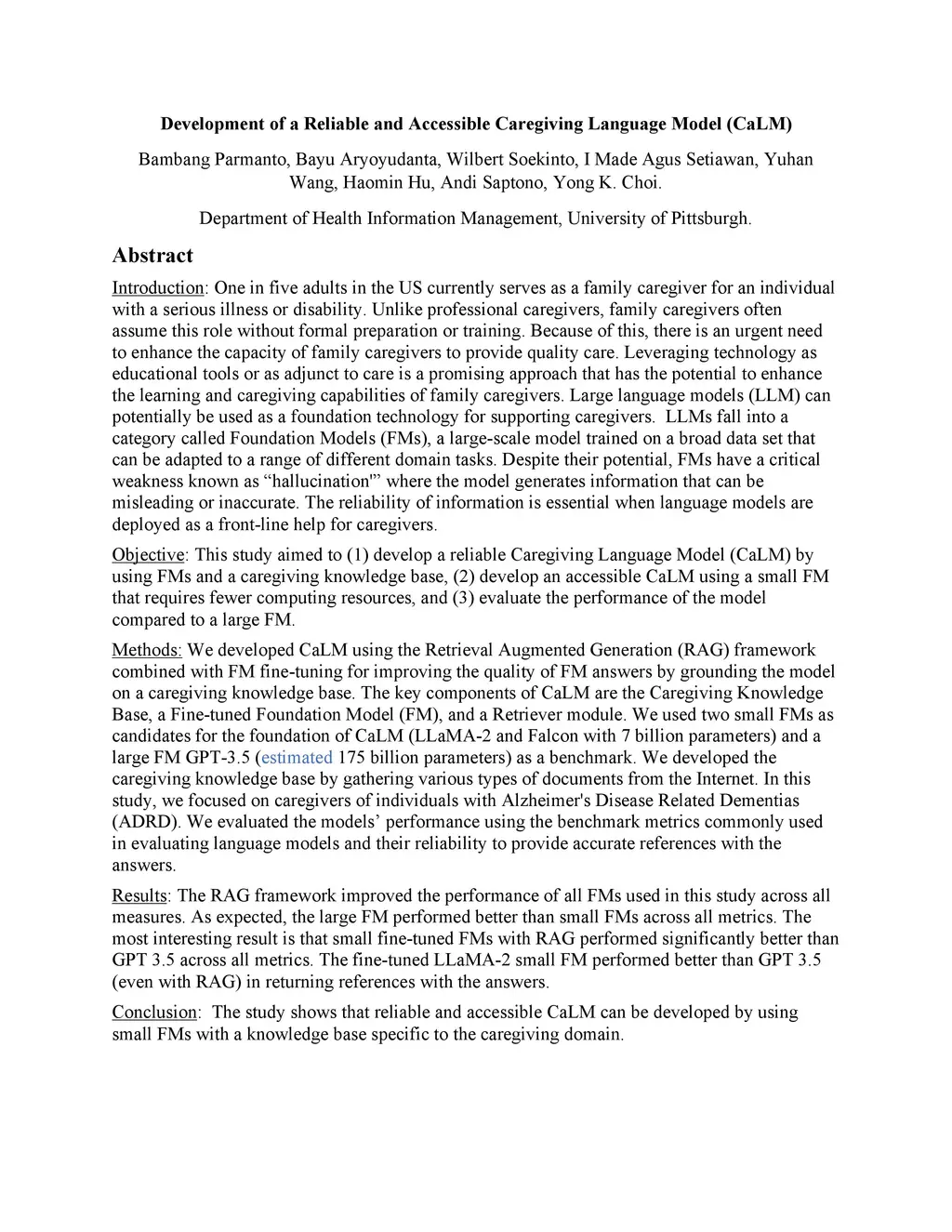 Unlike professional caregivers, family caregivers often assume this role without formal preparation or training. Because of this, there is an urgent need to enhance the capacity of family caregivers to provide quality care. Large language models can potentially be used as a foundation technology for supporting caregivers as educational tools or as adjunct to care. This study aimed to develop a reliable Caregiving Language Model (CaLM) by using FMs and a caregiving knowledge base, develop an accessible CaLM using a small FM that requires fewer computing resources, and evaluate the performance of the model compared to a large FM. We developed CaLM using the Retrieval Augmented Generation (RAG) framework combined with FM fine-tuning for improving the quality of FM answers by grounding the model on a caregiving knowledge base. We used two small FMs as candidates for the FM of CaLM (LLaMA-2 and Falcon with 7B parameters) and larger FM GPT-3.5 as a benchmark. We developed the caregiving knowledge base by gathering various types of documents from the Internet. In this study, we focused on caregivers of individuals with Alzheimer's Disease Related Dementias. We evaluated the models' performance using the benchmark metrics commonly used in evaluating language models and their reliability to provide accurate references with the answers. The RAG framework improved the performance of all FMs used in this study across all measures. As expected, the large FM performed better than small FMs across all metrics. The most interesting result is that small fine-tuned FMs with RAG performed significantly better than GPT 3.5 across all metrics. The fine-tuned LLaMA-2 small FM performed better than GPT 3.5 (even with RAG) in returning references with the answers. The study shows that reliable and accessible CaLM can be developed by using small FMs with a knowledge base specific to the caregiving domain.