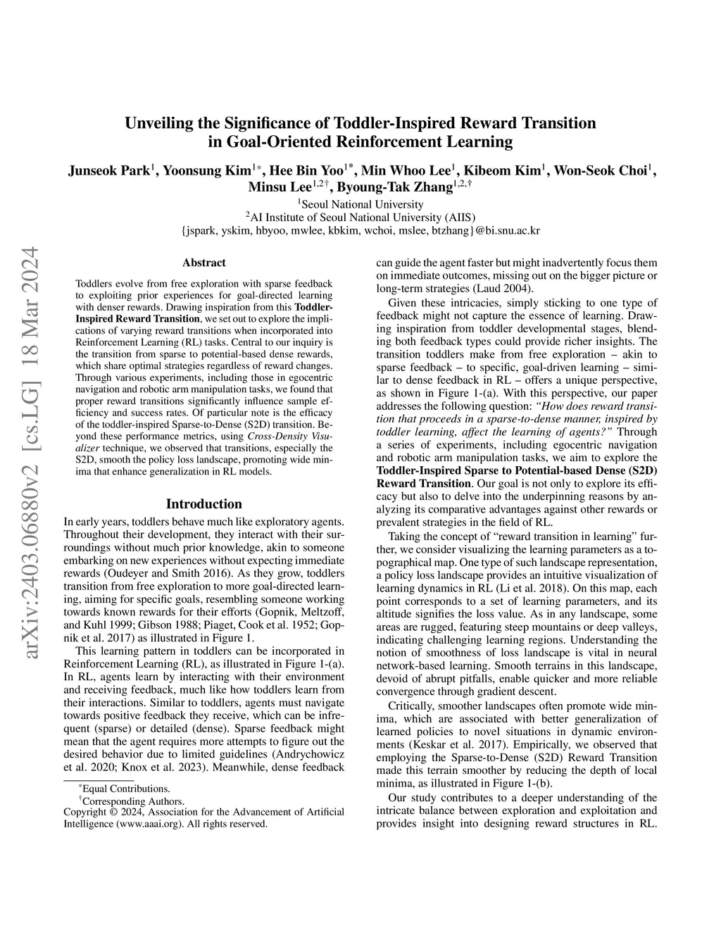 Toddlers evolve from free exploration with sparse feedback to exploiting prior experiences for goal-directed learning with denser rewards. Drawing inspiration from this Toddler-Inspired Reward Transition, we set out to explore the implications of varying reward transitions when incorporated into Reinforcement Learning (RL) tasks. Central to our inquiry is the transition from sparse to potential-based dense rewards, which share optimal strategies regardless of reward changes. Through various experiments, including those in egocentric navigation and robotic arm manipulation tasks, we found that proper reward transitions significantly influence sample efficiency and success rates. Of particular note is the efficacy of the toddler-inspired Sparse-to-Dense (S2D) transition. Beyond these performance metrics, using Cross-Density Visualizer technique, we observed that transitions, especially the S2D, smooth the policy loss landscape, promoting wide minima that enhance generalization in RL models.