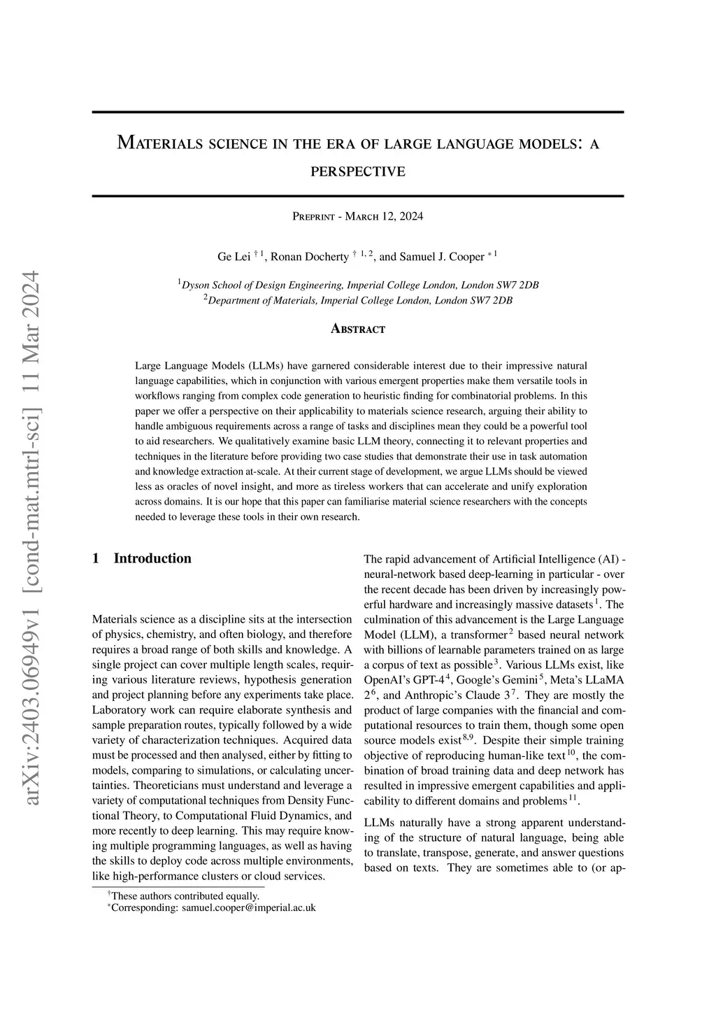 Large Language Models (LLMs) have garnered considerable interest due to their impressive natural language capabilities, which in conjunction with various emergent properties make them versatile tools in workflows ranging from complex code generation to heuristic finding for combinatorial problems. In this paper we offer a perspective on their applicability to materials science research, arguing their ability to handle ambiguous requirements across a range of tasks and disciplines mean they could be a powerful tool to aid researchers. We qualitatively examine basic LLM theory, connecting it to relevant properties and techniques in the literature before providing two case studies that demonstrate their use in task automation and knowledge extraction at-scale. At their current stage of development, we argue LLMs should be viewed less as oracles of novel insight, and more as tireless workers that can accelerate and unify exploration across domains. It is our hope that this paper can familiarise material science researchers with the concepts needed to leverage these tools in their own research.