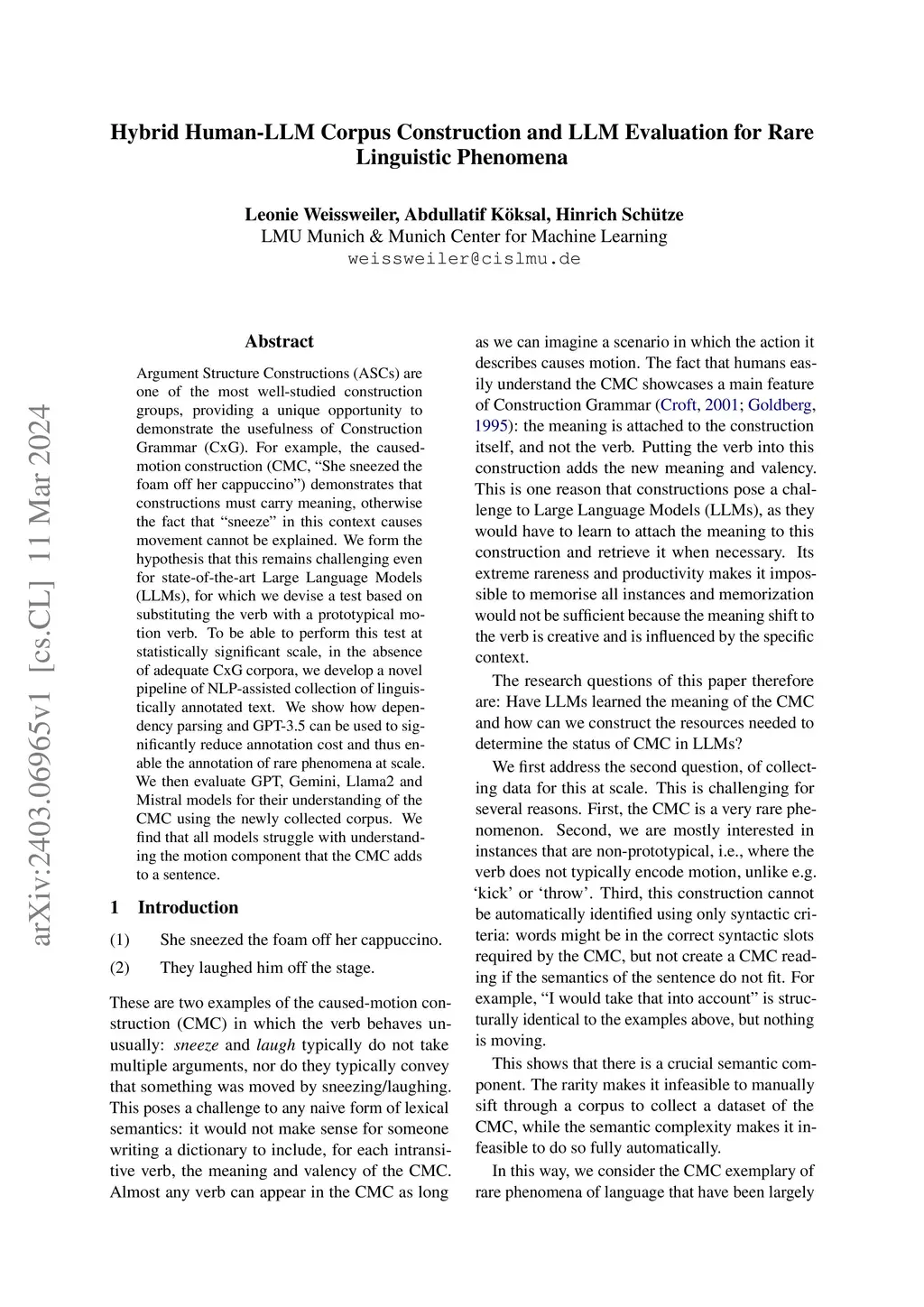 Argument Structure Constructions (ASCs) are one of the most well-studied construction groups, providing a unique opportunity to demonstrate the usefulness of Construction Grammar (CxG). For example, the caused-motion construction (CMC, ``She sneezed the foam off her cappuccino'') demonstrates that constructions must carry meaning, otherwise the fact that ``sneeze'' in this context causes movement cannot be explained. We form the hypothesis that this remains challenging even for state-of-the-art Large Language Models (LLMs), for which we devise a test based on substituting the verb with a prototypical motion verb. To be able to perform this test at statistically significant scale, in the absence of adequate CxG corpora, we develop a novel pipeline of NLP-assisted collection of linguistically annotated text. We show how dependency parsing and GPT-3.5 can be used to significantly reduce annotation cost and thus enable the annotation of rare phenomena at scale. We then evaluate GPT, Gemini, Llama2 and Mistral models for their understanding of the CMC using the newly collected corpus. We find that all models struggle with understanding the motion component that the CMC adds to a sentence.