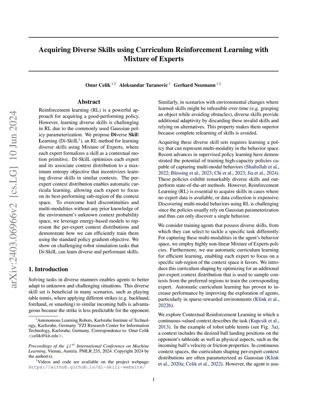 Reinforcement learning (RL) is a powerful approach for acquiring a good-performing policy. However, learning diverse skills is challenging in RL due to the commonly used Gaussian policy parameterization. We propose \textbf{Di}verse \textbf{Skil}l \textbf{L}earning (Di-SkilL\footnote{Videos and code are available on the project webpage: \url{https://alrhub.github.io/di-skill-website/}}), an RL method for learning diverse skills using Mixture of Experts, where each expert formalizes a skill as a contextual motion primitive. Di-SkilL optimizes each expert and its associate context distribution to a maximum entropy objective that incentivizes learning diverse skills in similar contexts. The per-expert context distribution enables automatic curricula learning, allowing each expert to focus on its best-performing sub-region of the context space. To overcome hard discontinuities and multi-modalities without any prior knowledge of the environment's unknown context probability space, we leverage energy-based models to represent the per-expert context distributions and demonstrate how we can efficiently train them using the standard policy gradient objective. We show on challenging robot simulation tasks that Di-SkilL can learn diverse and performant skills.