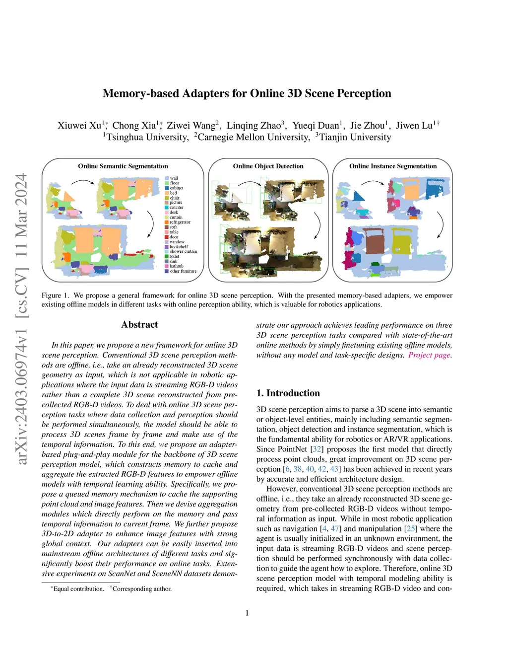 In this paper, we propose a new framework for online 3D scene perception. Conventional 3D scene perception methods are offline, i.e., take an already reconstructed 3D scene geometry as input, which is not applicable in robotic applications where the input data is streaming RGB-D videos rather than a complete 3D scene reconstructed from pre-collected RGB-D videos. To deal with online 3D scene perception tasks where data collection and perception should be performed simultaneously, the model should be able to process 3D scenes frame by frame and make use of the temporal information. To this end, we propose an adapter-based plug-and-play module for the backbone of 3D scene perception model, which constructs memory to cache and aggregate the extracted RGB-D features to empower offline models with temporal learning ability. Specifically, we propose a queued memory mechanism to cache the supporting point cloud and image features. Then we devise aggregation modules which directly perform on the memory and pass temporal information to current frame. We further propose 3D-to-2D adapter to enhance image features with strong global context. Our adapters can be easily inserted into mainstream offline architectures of different tasks and significantly boost their performance on online tasks. Extensive experiments on ScanNet and SceneNN datasets demonstrate our approach achieves leading performance on three 3D scene perception tasks compared with state-of-the-art online methods by simply finetuning existing offline models, without any model and task-specific designs. \href{https://xuxw98.github.io/Online3D/}{Project page}.