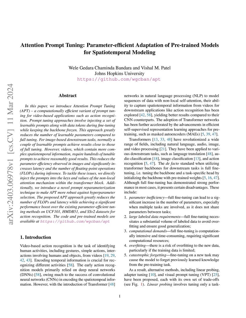 Attention Prompt Tuning: Parameter-efficient Adaptation of Pre-trained