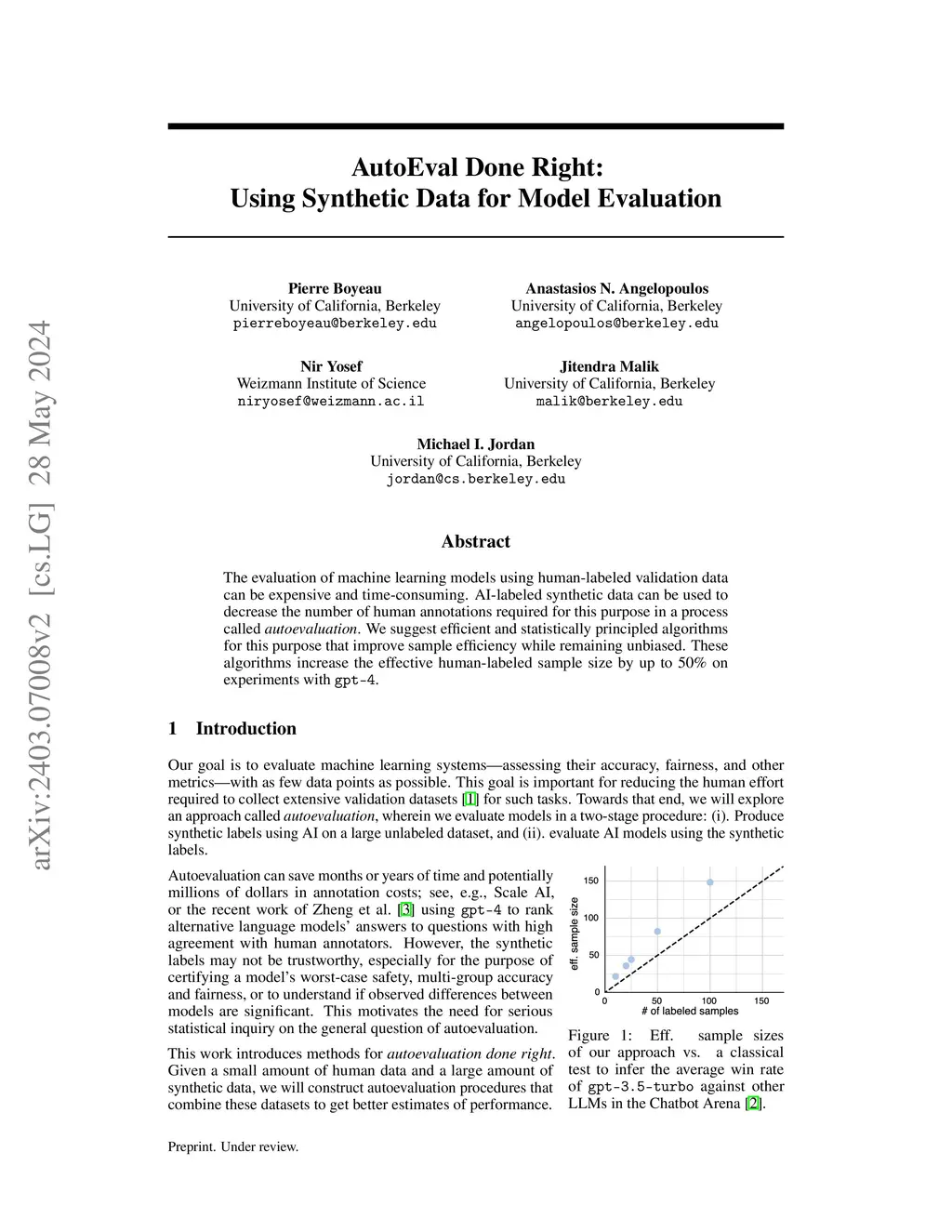 The evaluation of machine learning models using human-labeled validation data can be expensive and time-consuming. AI-labeled synthetic data can be used to decrease the number of human annotations required for this purpose in a process called autoevaluation. We suggest efficient and statistically principled algorithms for this purpose that improve sample efficiency while remaining unbiased. These algorithms increase the effective human-labeled sample size by up to 50% on experiments with GPT-4.