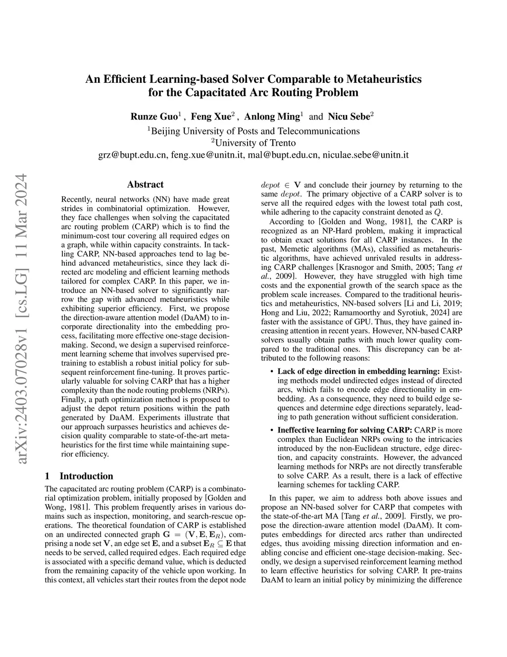 Recently, neural networks (NN) have made great strides in combinatorial optimization. However, they face challenges when solving the capacitated arc routing problem (CARP) which is to find the minimum-cost tour covering all required edges on a graph, while within capacity constraints. In tackling CARP, NN-based approaches tend to lag behind advanced metaheuristics, since they lack directed arc modeling and efficient learning methods tailored for complex CARP. In this paper, we introduce an NN-based solver to significantly narrow the gap with advanced metaheuristics while exhibiting superior efficiency. First, we propose the direction-aware attention model (DaAM) to incorporate directionality into the embedding process, facilitating more effective one-stage decision-making. Second, we design a supervised reinforcement learning scheme that involves supervised pre-training to establish a robust initial policy for subsequent reinforcement fine-tuning. It proves particularly valuable for solving CARP that has a higher complexity than the node routing problems (NRPs). Finally, a path optimization method is proposed to adjust the depot return positions within the path generated by DaAM. Experiments illustrate that our approach surpasses heuristics and achieves decision quality comparable to state-of-the-art metaheuristics for the first time while maintaining superior efficiency.