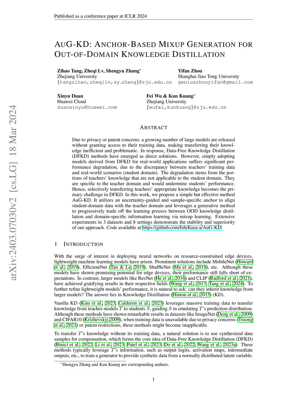 AuG-KD: Anchor-Based Mixup Generation for Out-of-Domain Knowledge