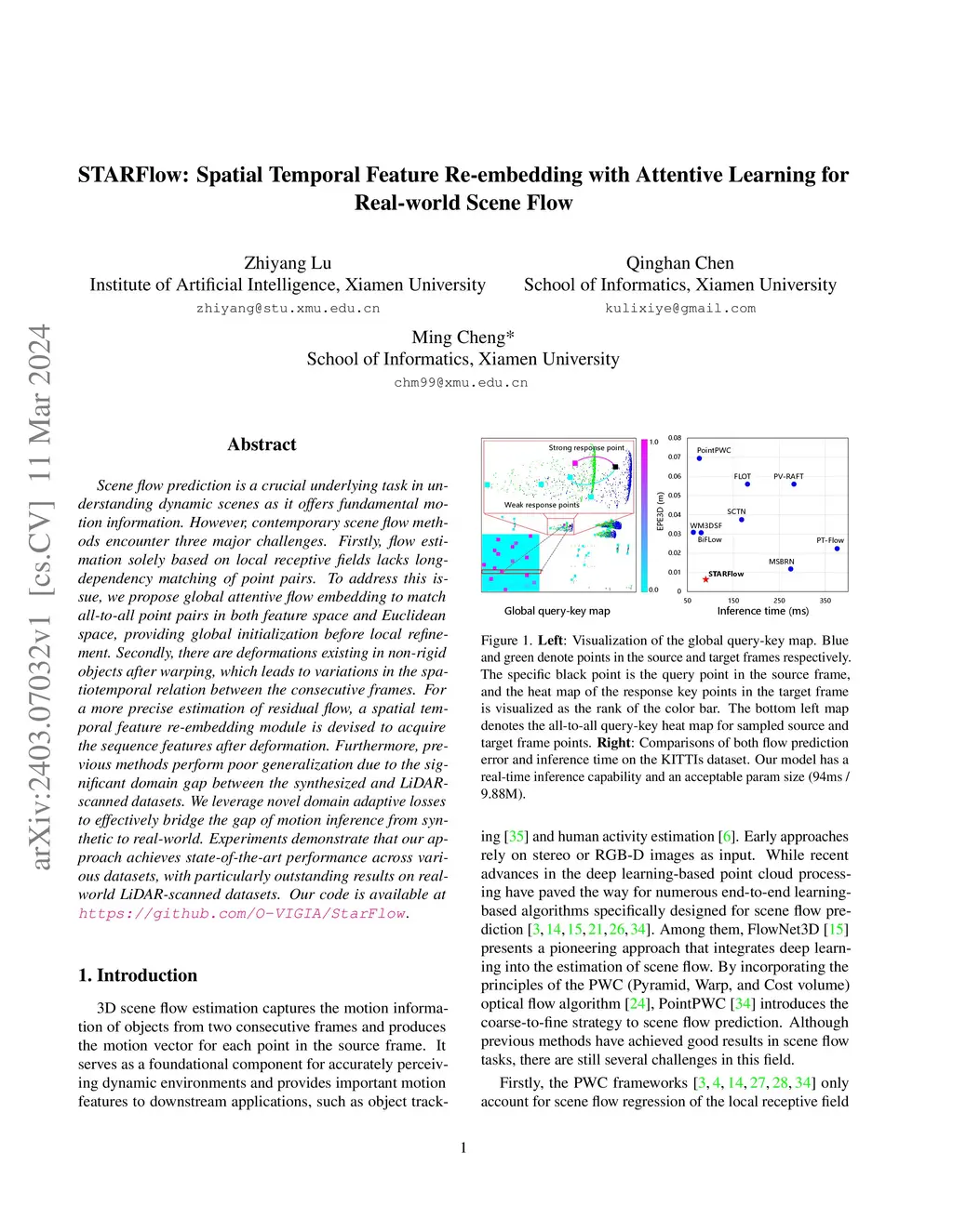 Scene flow prediction is a crucial underlying task in understanding dynamic scenes as it offers fundamental motion information. However, contemporary scene flow methods encounter three major challenges. Firstly, flow estimation solely based on local receptive fields lacks long-dependency matching of point pairs. To address this issue, we propose global attentive flow embedding to match all-to-all point pairs in both feature space and Euclidean space, providing global initialization before local refinement. Secondly, there are deformations existing in non-rigid objects after warping, which leads to variations in the spatiotemporal relation between the consecutive frames. For a more precise estimation of residual flow, a spatial temporal feature re-embedding module is devised to acquire the sequence features after deformation. Furthermore, previous methods perform poor generalization due to the significant domain gap between the synthesized and LiDAR-scanned datasets. We leverage novel domain adaptive losses to effectively bridge the gap of motion inference from synthetic to real-world. Experiments demonstrate that our approach achieves state-of-the-art performance across various datasets, with particularly outstanding results on real-world LiDAR-scanned datasets. Our code is available at https://github.com/O-VIGIA/StarFlow.