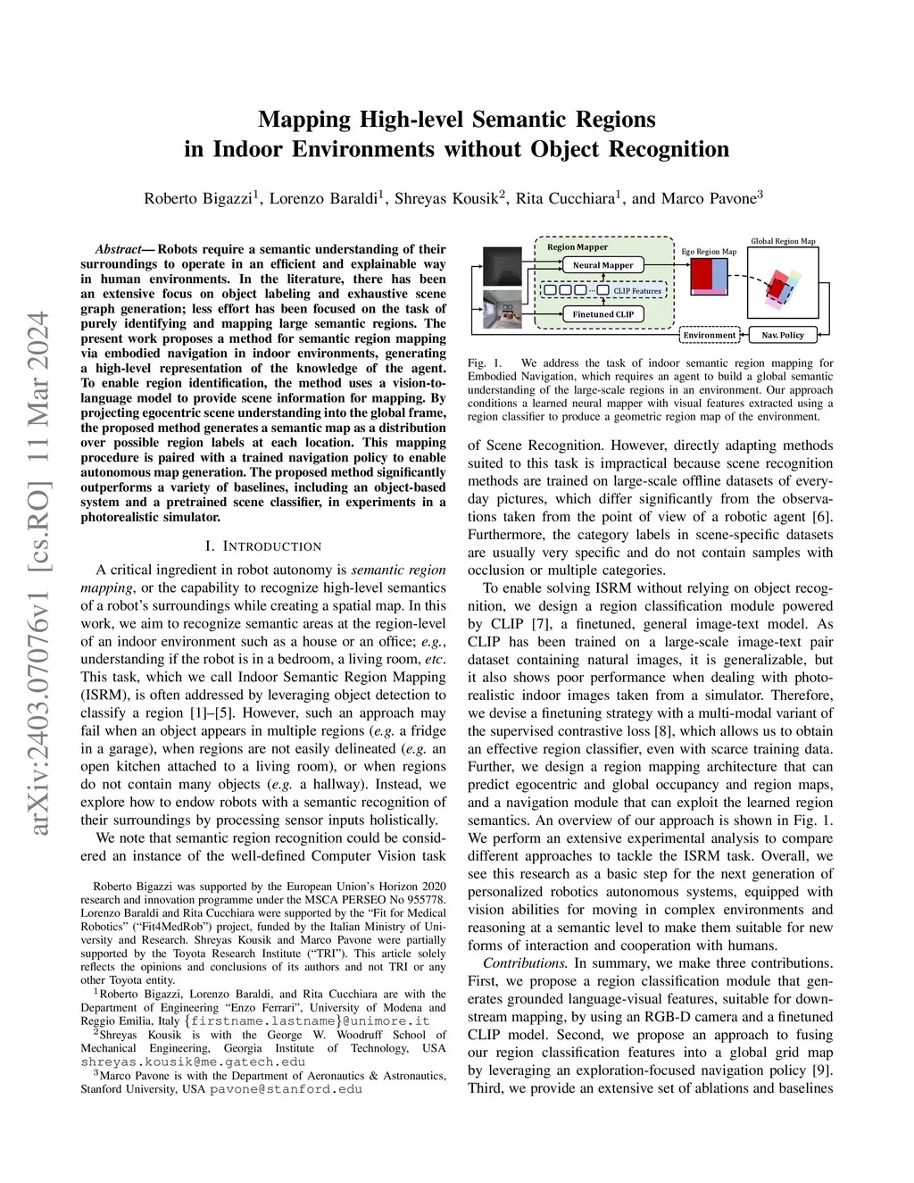 Robots require a semantic understanding of their surroundings to operate in an efficient and explainable way in human environments. In the literature, there has been an extensive focus on object labeling and exhaustive scene graph generation; less effort has been focused on the task of purely identifying and mapping large semantic regions. The present work proposes a method for semantic region mapping via embodied navigation in indoor environments, generating a high-level representation of the knowledge of the agent. To enable region identification, the method uses a vision-to-language model to provide scene information for mapping. By projecting egocentric scene understanding into the global frame, the proposed method generates a semantic map as a distribution over possible region labels at each location. This mapping procedure is paired with a trained navigation policy to enable autonomous map generation. The proposed method significantly outperforms a variety of baselines, including an object-based system and a pretrained scene classifier, in experiments in a photorealistic simulator.