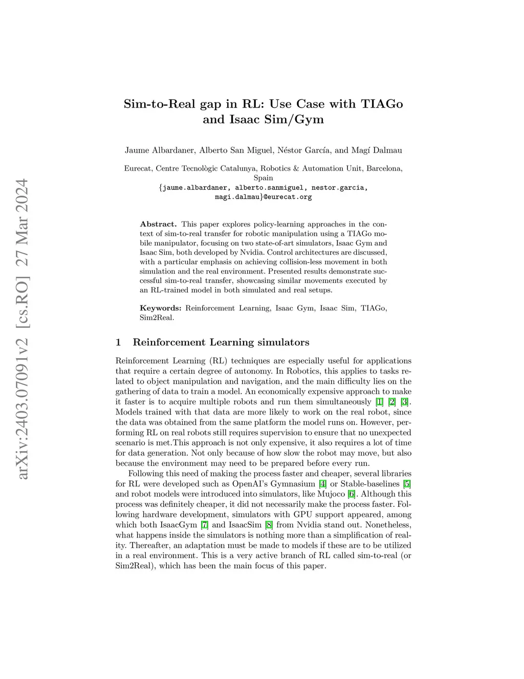 Sim-to-Real gap in RL: Use Case with TIAGo and Isaac Sim/Gym