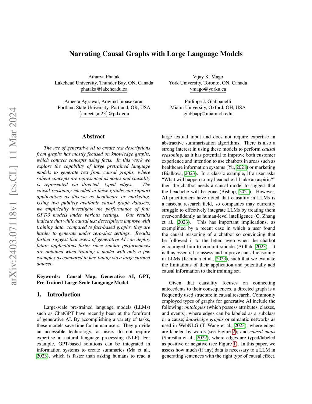 The use of generative AI to create text descriptions from graphs has mostly focused on knowledge graphs, which connect concepts using facts. In this work we explore the capability of large pretrained language models to generate text from causal graphs, where salient concepts are represented as nodes and causality is represented via directed, typed edges. The causal reasoning encoded in these graphs can support applications as diverse as healthcare or marketing. Using two publicly available causal graph datasets, we empirically investigate the performance of four GPT-3 models under various settings. Our results indicate that while causal text descriptions improve with training data, compared to fact-based graphs, they are harder to generate under zero-shot settings. Results further suggest that users of generative AI can deploy future applications faster since similar performances are obtained when training a model with only a few examples as compared to fine-tuning via a large curated dataset.