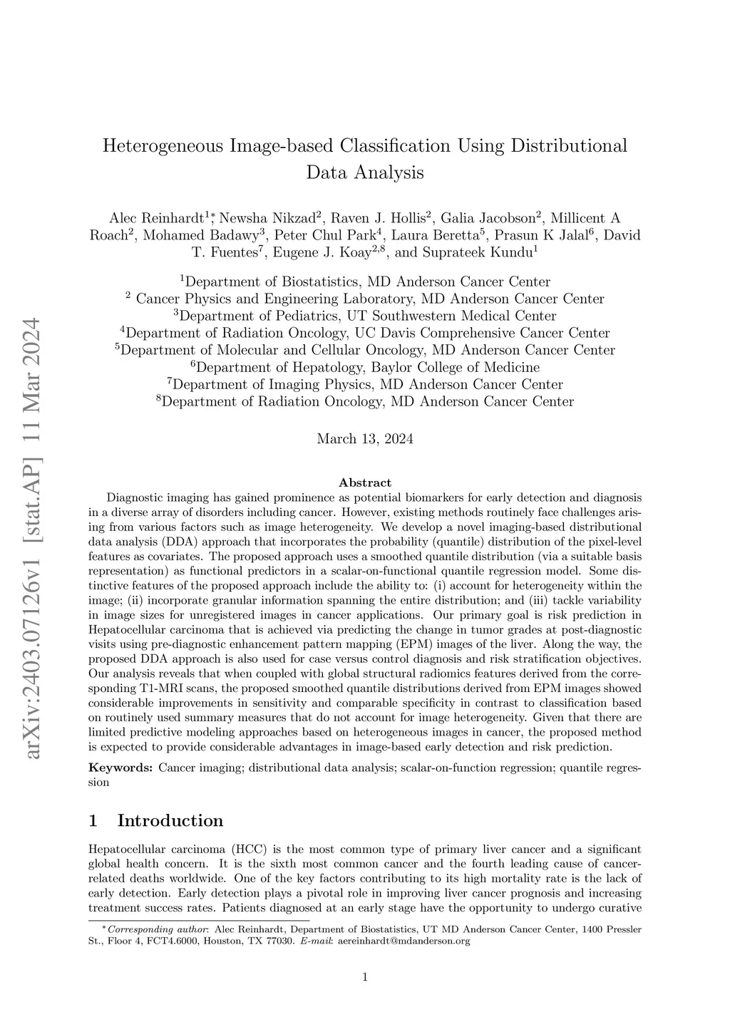 Diagnostic imaging has gained prominence as potential biomarkers for early detection and diagnosis in a diverse array of disorders including cancer. However, existing methods routinely face challenges arising from various factors such as image heterogeneity. We develop a novel imaging-based distributional data analysis (DDA) approach that incorporates the probability (quantile) distribution of the pixel-level features as covariates. The proposed approach uses a smoothed quantile distribution (via a suitable basis representation) as functional predictors in a scalar-on-functional quantile regression model. Some distinctive features of the proposed approach include the ability to: (i) account for heterogeneity within the image; (ii) incorporate granular information spanning the entire distribution; and (iii) tackle variability in image sizes for unregistered images in cancer applications. Our primary goal is risk prediction in Hepatocellular carcinoma that is achieved via predicting the change in tumor grades at post-diagnostic visits using pre-diagnostic enhancement pattern mapping (EPM) images of the liver. Along the way, the proposed DDA approach is also used for case versus control diagnosis and risk stratification objectives. Our analysis reveals that when coupled with global structural radiomics features derived from the corresponding T1-MRI scans, the proposed smoothed quantile distributions derived from EPM images showed considerable improvements in sensitivity and comparable specificity in contrast to classification based on routinely used summary measures that do not account for image heterogeneity. Given that there are limited predictive modeling approaches based on heterogeneous images in cancer, the proposed method is expected to provide considerable advantages in image-based early detection and risk prediction.