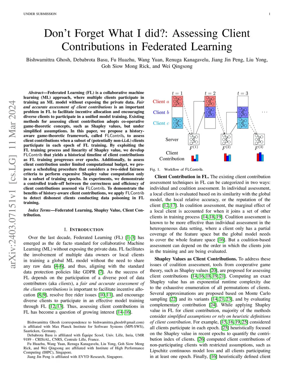 Federated Learning (FL) is a collaborative machine learning (ML) approach, where multiple clients participate in training an ML model without exposing their private data. Fair and accurate assessment of client contributions facilitates incentive allocation in FL and encourages diverse clients to participate in a unified model training. Existing methods for contribution assessment adopts a co-operative game-theoretic concept, called Shapley value, but under restricted assumptions, e.g., all clients' participating in all epochs or at least in one epoch of FL.We propose a history-aware client contribution assessment framework, called FLContrib, where client-participation is dynamic, i.e., a subset of clients participates in each epoch. The theoretical underpinning of FLContrib is based on the Markovian training process of FL. Under this setting, we directly apply the linearity property of Shapley value and compute a historical timeline of client contributions. Considering the possibility of a limited computational budget, we propose a two-sided fairness criteria to schedule Shapley value computation in a subset of epochs. Empirically, FLContrib is efficient and consistently accurate in estimating contribution across multiple utility functions. As a practical application, we apply FLContrib to detect dishonest clients in FL based on historical Shaplee values.