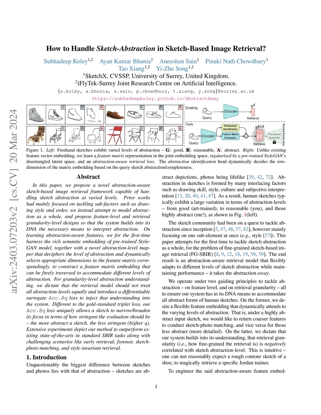 In this paper, we propose a novel abstraction-aware sketch-based image retrieval framework capable of handling sketch abstraction at varied levels. Prior works had mainly focused on tackling sub-factors such as drawing style and order, we instead attempt to model abstraction as a whole, and propose feature-level and retrieval granularity-level designs so that the system builds into its DNA the necessary means to interpret abstraction. On learning abstraction-aware features, we for the first-time harness the rich semantic embedding of pre-trained StyleGAN model, together with a novel abstraction-level mapper that deciphers the level of abstraction and dynamically selects appropriate dimensions in the feature matrix correspondingly, to construct a feature matrix embedding that can be freely traversed to accommodate different levels of abstraction. For granularity-level abstraction understanding, we dictate that the retrieval model should not treat all abstraction-levels equally and introduce a differentiable surrogate Acc.@q loss to inject that understanding into the system. Different to the gold-standard triplet loss, our Acc.@q loss uniquely allows a sketch to narrow/broaden its focus in terms of how stringent the evaluation should be - the more abstract a sketch, the less stringent (higher q). Extensive experiments depict our method to outperform existing state-of-the-arts in standard SBIR tasks along with challenging scenarios like early retrieval, forensic sketch-photo matching, and style-invariant retrieval.
