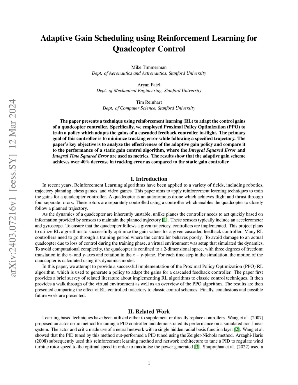 The paper presents a technique using reinforcement learning (RL) to adapt the control gains of a quadcopter controller. Specifically, we employed Proximal Policy Optimization (PPO) to train a policy which adapts the gains of a cascaded feedback controller in-flight. The primary goal of this controller is to minimize tracking error while following a specified trajectory. The paper's key objective is to analyze the effectiveness of the adaptive gain policy and compare it to the performance of a static gain control algorithm, where the Integral Squared Error and Integral Time Squared Error are used as metrics. The results show that the adaptive gain scheme achieves over 40 decrease in tracking error as compared to the static gain controller.