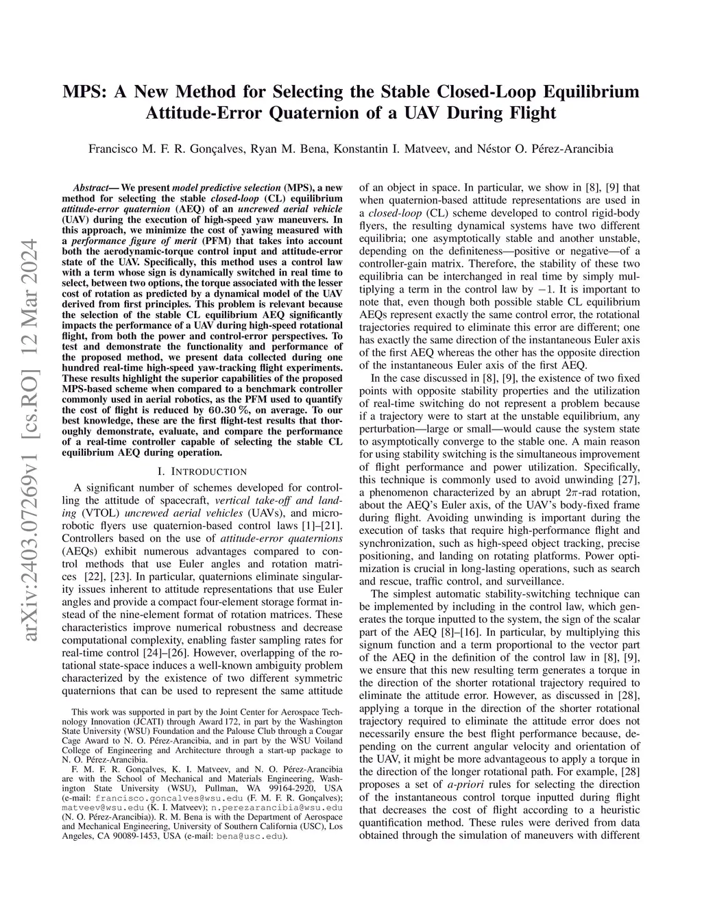 We present model predictive selection (MPS), a new method for selecting the stable closed-loop (CL) equilibrium attitude-error quaternion (AEQ) of an uncrewed aerial vehicle (UAV) during the execution of high-speed yaw maneuvers. In this approach, we minimize the cost of yawing measured with a performance figure of merit (PFM) that takes into account both the aerodynamic-torque control input and attitude-error state of the UAV. Specifically, this method uses a control law with a term whose sign is dynamically switched in real time to select, between two options, the torque associated with the lesser cost of rotation as predicted by a dynamical model of the UAV derived from first principles. This problem is relevant because the selection of the stable CL equilibrium AEQ significantly impacts the performance of a UAV during high-speed rotational flight, from both the power and control-error perspectives. To test and demonstrate the functionality and performance of the proposed method, we present data collected during one hundred real-time high-speed yaw-tracking flight experiments. These results highlight the superior capabilities of the proposed MPS-based scheme when compared to a benchmark controller commonly used in aerial robotics, as the PFM used to quantify the cost of flight is reduced by 60.30 %, on average. To our best knowledge, these are the first flight-test results that thoroughly demonstrate, evaluate, and compare the performance of a real-time controller capable of selecting the stable CL equilibrium AEQ during operation.