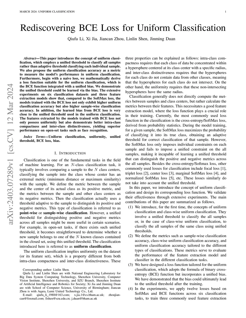 This paper introduces the concept of uniform classification, which employs a unified threshold to classify all samples rather than adaptive threshold classifying each individual sample. We also propose the uniform classification accuracy as a metric to measure the model's performance in uniform classification. Furthermore, begin with a naive loss, we mathematically derive a loss function suitable for the uniform classification, which is the BCE function integrated with a unified bias. We demonstrate the unified threshold could be learned via the bias. The extensive experiments on six classification datasets and three feature extraction models show that, compared to the SoftMax loss, the models trained with the BCE loss not only exhibit higher uniform classification accuracy but also higher sample-wise classification accuracy. In addition, the learned bias from BCE loss is very close to the unified threshold used in the uniform classification. The features extracted by the models trained with BCE loss not only possess uniformity but also demonstrate better intra-class compactness and inter-class distinctiveness, yielding superior performance on open-set tasks such as face recognition.