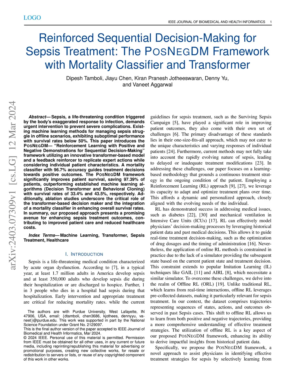 Sepsis, a life-threatening condition triggered by the body's exaggerated response to infection, demands urgent intervention to prevent severe complications. Existing machine learning methods for managing sepsis struggle in offline scenarios, exhibiting suboptimal performance with survival rates below 50%. This paper introduces the POSNEGDM -- ``Reinforcement Learning with Positive and Negative Demonstrations for Sequential Decision-Making" framework utilizing an innovative transformer-based model and a feedback reinforcer to replicate expert actions while considering individual patient characteristics. A mortality classifier with 96.7\% accuracy guides treatment decisions towards positive outcomes. The POSNEGDM framework significantly improves patient survival, saving 97.39% of patients, outperforming established machine learning algorithms (Decision Transformer and Behavioral Cloning) with survival rates of 33.4% and 43.5%, respectively. Additionally, ablation studies underscore the critical role of the transformer-based decision maker and the integration of a mortality classifier in enhancing overall survival rates. In summary, our proposed approach presents a promising avenue for enhancing sepsis treatment outcomes, contributing to improved patient care and reduced healthcare costs.