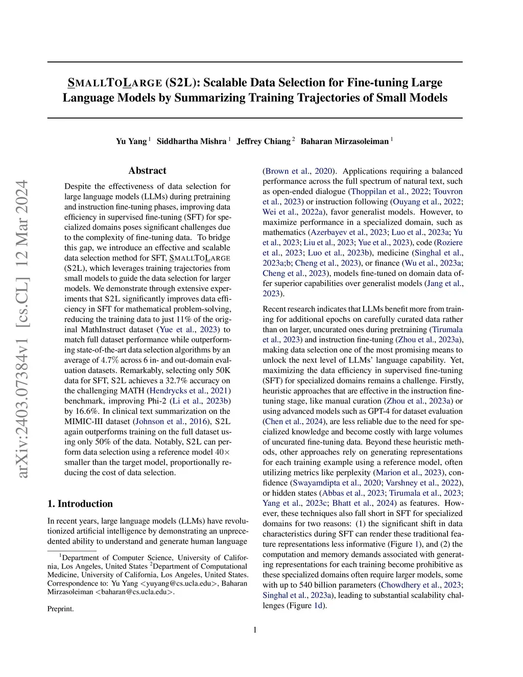 Despite the effectiveness of data selection for large language models (LLMs) during pretraining and instruction fine-tuning phases, improving data efficiency in supervised fine-tuning (SFT) for specialized domains poses significant challenges due to the complexity of fine-tuning data. To bridge this gap, we introduce an effective and scalable data selection method for SFT, SmallToLarge (S2L), which leverages training trajectories from small models to guide the data selection for larger models. We demonstrate through extensive experiments that S2L significantly improves data efficiency in SFT for mathematical problem-solving, reducing the training data to just 11% of the original MathInstruct dataset (Yue et al., 2023) to match full dataset performance while outperforming state-of-the-art data selection algorithms by an average of 4.7% across 6 in- and out-domain evaluation datasets. Remarkably, selecting only 50K data for SFT, S2L achieves a 32.7% accuracy on the most challenging MATH (Hendrycks et al., 2021) benchmark, improving Phi-2 (Li et al., 2023b) by 16.6%. In clinical text summarization on the MIMIC-III dataset (Johnson et al., 2016), S2L again outperforms training on the full dataset using only 50% of the data. Notably, S2L can perform data selection using a reference model 40x smaller than the target model, proportionally reducing the cost of data selection.