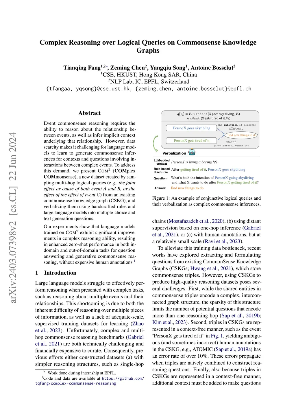Event commonsense reasoning requires the ability to reason about the relationship between events, as well as infer implicit context underlying that relationship. However, data scarcity makes it challenging for language models to learn to generate commonsense inferences for contexts and questions involving interactions between complex events. To address this demand, we present COM2 (COMplex COMmonsense), a new dataset created by sampling multi-hop logical queries (e.g., the joint effect or cause of both event A and B, or the effect of the effect of event C) from an existing commonsense knowledge graph (CSKG), and verbalizing them using handcrafted rules and large language models into multiple-choice and text generation questions. Our experiments show that language models trained on COM2 exhibit significant improvements in complex reasoning ability, resulting in enhanced zero-shot performance in both in-domain and out-of-domain tasks for question answering and generative commonsense reasoning, without expensive human annotations. Code and data are available at https://github.com/tqfang/complex-commonsense-reasoning.