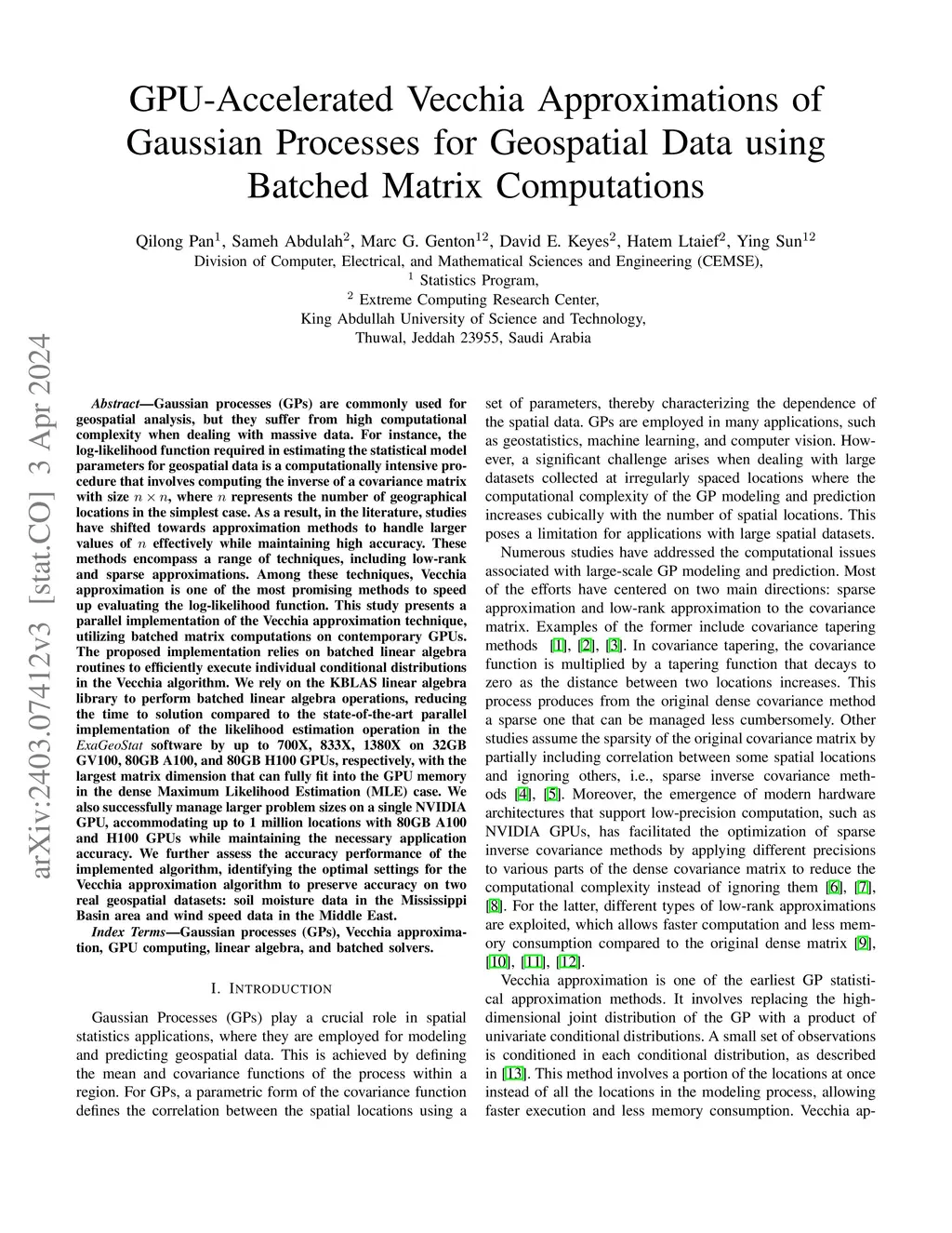 Gaussian processes (GPs) are commonly used for geospatial analysis, but they suffer from high computational complexity when dealing with massive data. For instance, the log-likelihood function required in estimating the statistical model parameters for geospatial data is a computationally intensive procedure that involves computing the inverse of a covariance matrix with size n X n, where n represents the number of geographical locations. As a result, in the literature, studies have shifted towards approximation methods to handle larger values of n effectively while maintaining high accuracy. These methods encompass a range of techniques, including low-rank and sparse approximations. Vecchia approximation is one of the most promising methods to speed up evaluating the log-likelihood function. This study presents a parallel implementation of the Vecchia approximation, utilizing batched matrix computations on contemporary GPUs. The proposed implementation relies on batched linear algebra routines to efficiently execute individual conditional distributions in the Vecchia algorithm. We rely on the KBLAS linear algebra library to perform batched linear algebra operations, reducing the time to solution compared to the state-of-the-art parallel implementation of the likelihood estimation operation in the ExaGeoStat software by up to 700X, 833X, 1380X on 32GB GV100, 80GB A100, and 80GB H100 GPUs, respectively. We also successfully manage larger problem sizes on a single NVIDIA GPU, accommodating up to 1M locations with 80GB A100 and H100 GPUs while maintaining the necessary application accuracy. We further assess the accuracy performance of the implemented algorithm, identifying the optimal settings for the Vecchia approximation algorithm to preserve accuracy on two real geospatial datasets: soil moisture data in the Mississippi Basin area and wind speed data in the Middle East.