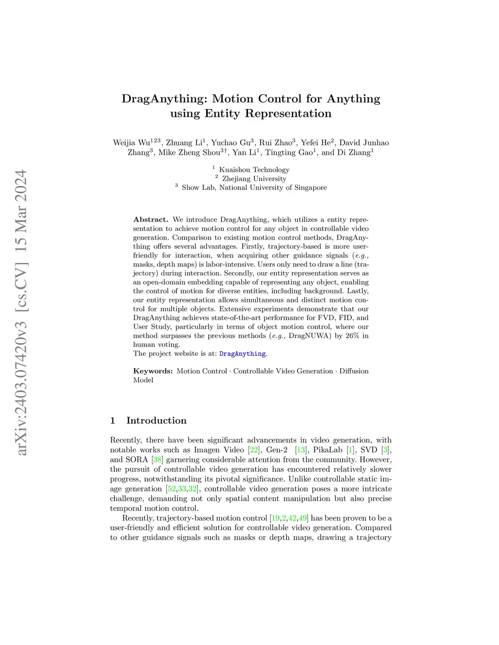 We introduce DragAnything, which utilizes a entity representation to achieve motion control for any object in controllable video generation. Comparison to existing motion control methods, DragAnything offers several advantages. Firstly, trajectory-based is more userfriendly for interaction, when acquiring other guidance signals (e.g., masks, depth maps) is labor-intensive. Users only need to draw a line (trajectory) during interaction. Secondly, our entity representation serves as an open-domain embedding capable of representing any object, enabling the control of motion for diverse entities, including background. Lastly, our entity representation allows simultaneous and distinct motion control for multiple objects. Extensive experiments demonstrate that our DragAnything achieves state-of-the-art performance for FVD, FID, and User Study, particularly in terms of object motion control, where our method surpasses the previous methods (e.g., DragNUWA) by 26% in human voting.