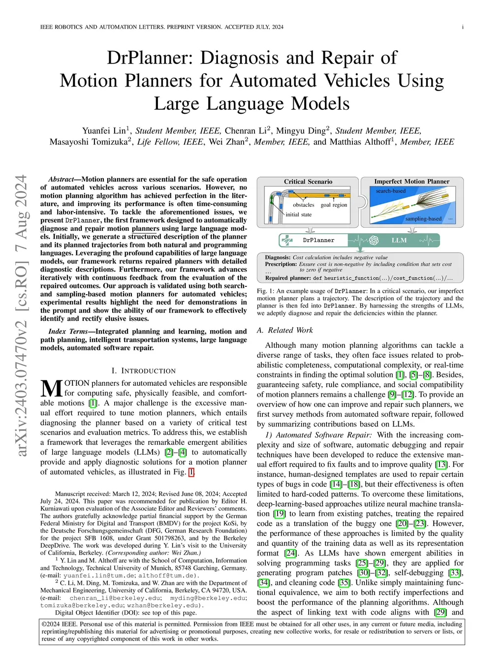 DrPlanner: Diagnosis and Repair of Motion Planners Using Large Language