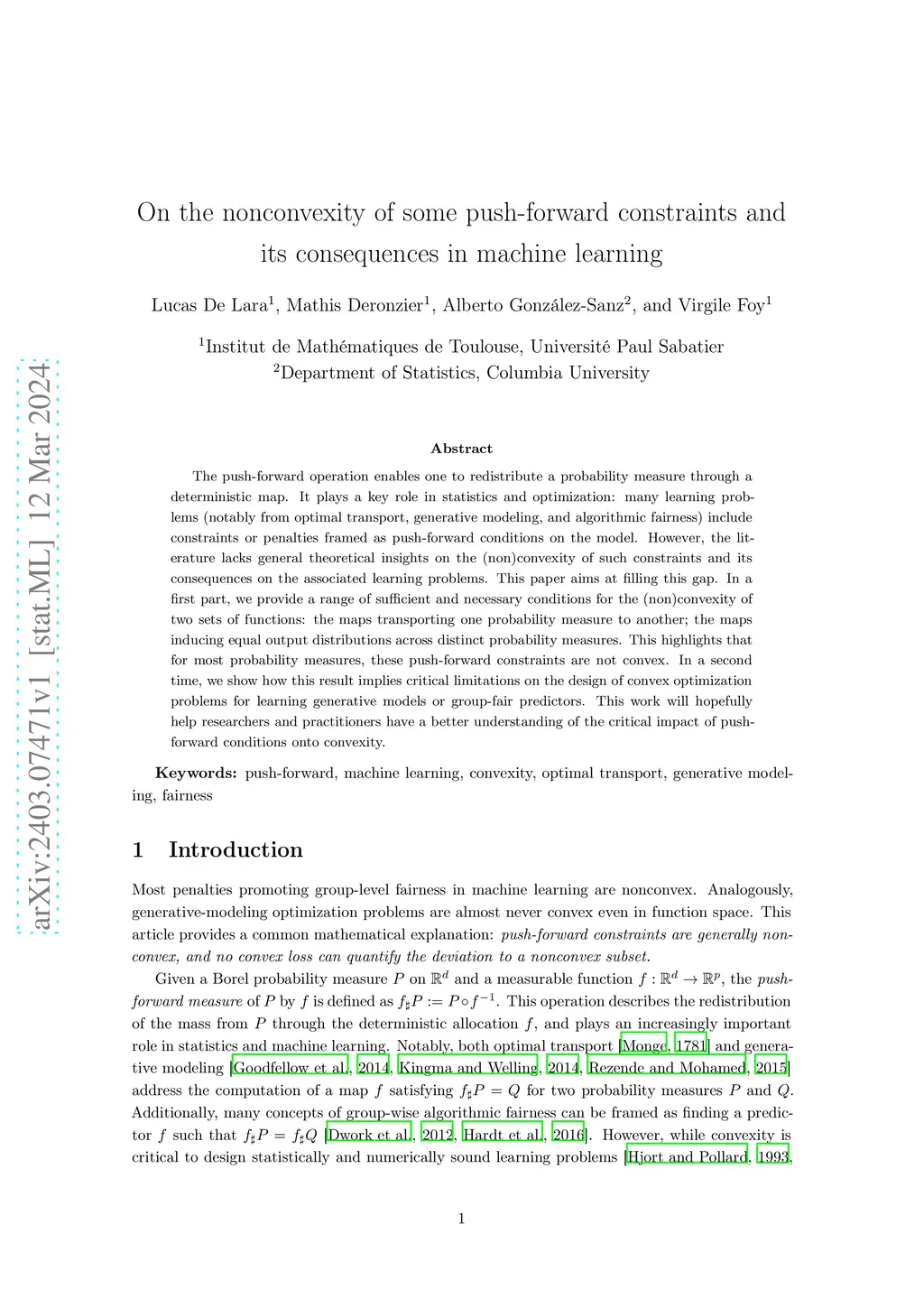 The push-forward operation enables one to redistribute a probability measure through a deterministic map. It plays a key role in statistics and optimization: many learning problems (notably from optimal transport, generative modeling, and algorithmic fairness) include constraints or penalties framed as push-forward conditions on the model. However, the literature lacks general theoretical insights on the (non)convexity of such constraints and its consequences on the associated learning problems. This paper aims at filling this gap. In a first part, we provide a range of sufficient and necessary conditions for the (non)convexity of two sets of functions: the maps transporting one probability measure to another; the maps inducing equal output distributions across distinct probability measures. This highlights that for most probability measures, these push-forward constraints are not convex. In a second time, we show how this result implies critical limitations on the design of convex optimization problems for learning generative models or group-fair predictors. This work will hopefully help researchers and practitioners have a better understanding of the critical impact of push-forward conditions onto convexity.