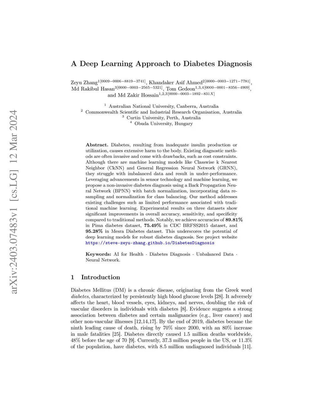 Diabetes, resulting from inadequate insulin production or utilization, causes extensive harm to the body. Existing diagnostic methods are often invasive and come with drawbacks, such as cost constraints. Although there are machine learning models like Classwise k Nearest Neighbor (CkNN) and General Regression Neural Network (GRNN), they struggle with imbalanced data and result in under-performance. Leveraging advancements in sensor technology and machine learning, we propose a non-invasive diabetes diagnosis using a Back Propagation Neural Network (BPNN) with batch normalization, incorporating data re-sampling and normalization for class balancing. Our method addresses existing challenges such as limited performance associated with traditional machine learning. Experimental results on three datasets show significant improvements in overall accuracy, sensitivity, and specificity compared to traditional methods. Notably, we achieve accuracies of 89.81% in Pima diabetes dataset, 75.49% in CDC BRFSS2015 dataset, and 95.28% in Mesra Diabetes dataset. This underscores the potential of deep learning models for robust diabetes diagnosis. See project website https://steve-zeyu-zhang.github.io/DiabetesDiagnosis/