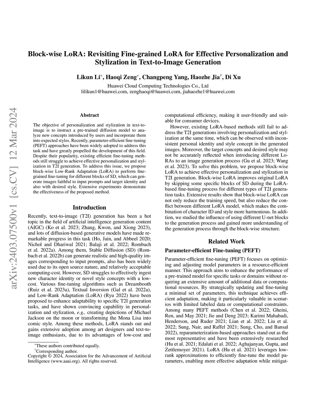The objective of personalization and stylization in text-to-image is to instruct a pre-trained diffusion model to analyze new concepts introduced by users and incorporate them into expected styles. Recently, parameter-efficient fine-tuning (PEFT) approaches have been widely adopted to address this task and have greatly propelled the development of this field. Despite their popularity, existing efficient fine-tuning methods still struggle to achieve effective personalization and stylization in T2I generation. To address this issue, we propose block-wise Low-Rank Adaptation (LoRA) to perform fine-grained fine-tuning for different blocks of SD, which can generate images faithful to input prompts and target identity and also with desired style. Extensive experiments demonstrate the effectiveness of the proposed method.