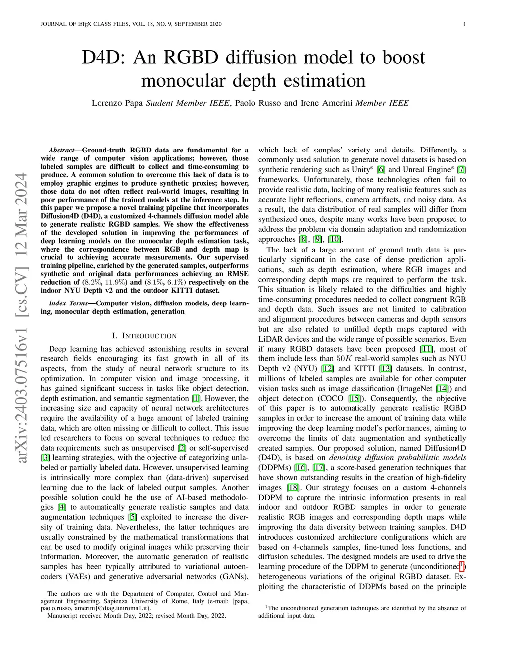 Ground-truth RGBD data are fundamental for a wide range of computer vision applications; however, those labeled samples are difficult to collect and time-consuming to produce. A common solution to overcome this lack of data is to employ graphic engines to produce synthetic proxies; however, those data do not often reflect real-world images, resulting in poor performance of the trained models at the inference step. In this paper we propose a novel training pipeline that incorporates Diffusion4D (D4D), a customized 4-channels diffusion model able to generate realistic RGBD samples. We show the effectiveness of the developed solution in improving the performances of deep learning models on the monocular depth estimation task, where the correspondence between RGB and depth map is crucial to achieving accurate measurements. Our supervised training pipeline, enriched by the generated samples, outperforms synthetic and original data performances achieving an RMSE reduction of (8.2%, 11.9%) and (8.1%, 6.1%) respectively on the indoor NYU Depth v2 and the outdoor KITTI dataset.