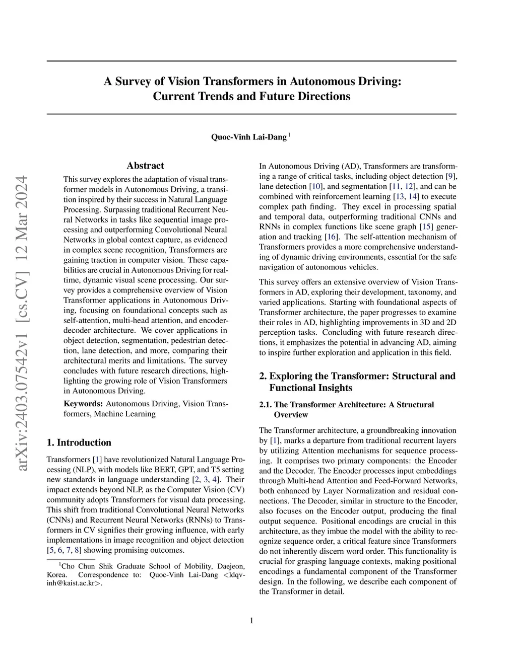 This survey explores the adaptation of visual transformer models in Autonomous Driving, a transition inspired by their success in Natural Language Processing. Surpassing traditional Recurrent Neural Networks in tasks like sequential image processing and outperforming Convolutional Neural Networks in global context capture, as evidenced in complex scene recognition, Transformers are gaining traction in computer vision. These capabilities are crucial in Autonomous Driving for real-time, dynamic visual scene processing. Our survey provides a comprehensive overview of Vision Transformer applications in Autonomous Driving, focusing on foundational concepts such as self-attention, multi-head attention, and encoder-decoder architecture. We cover applications in object detection, segmentation, pedestrian detection, lane detection, and more, comparing their architectural merits and limitations. The survey concludes with future research directions, highlighting the growing role of Vision Transformers in Autonomous Driving.