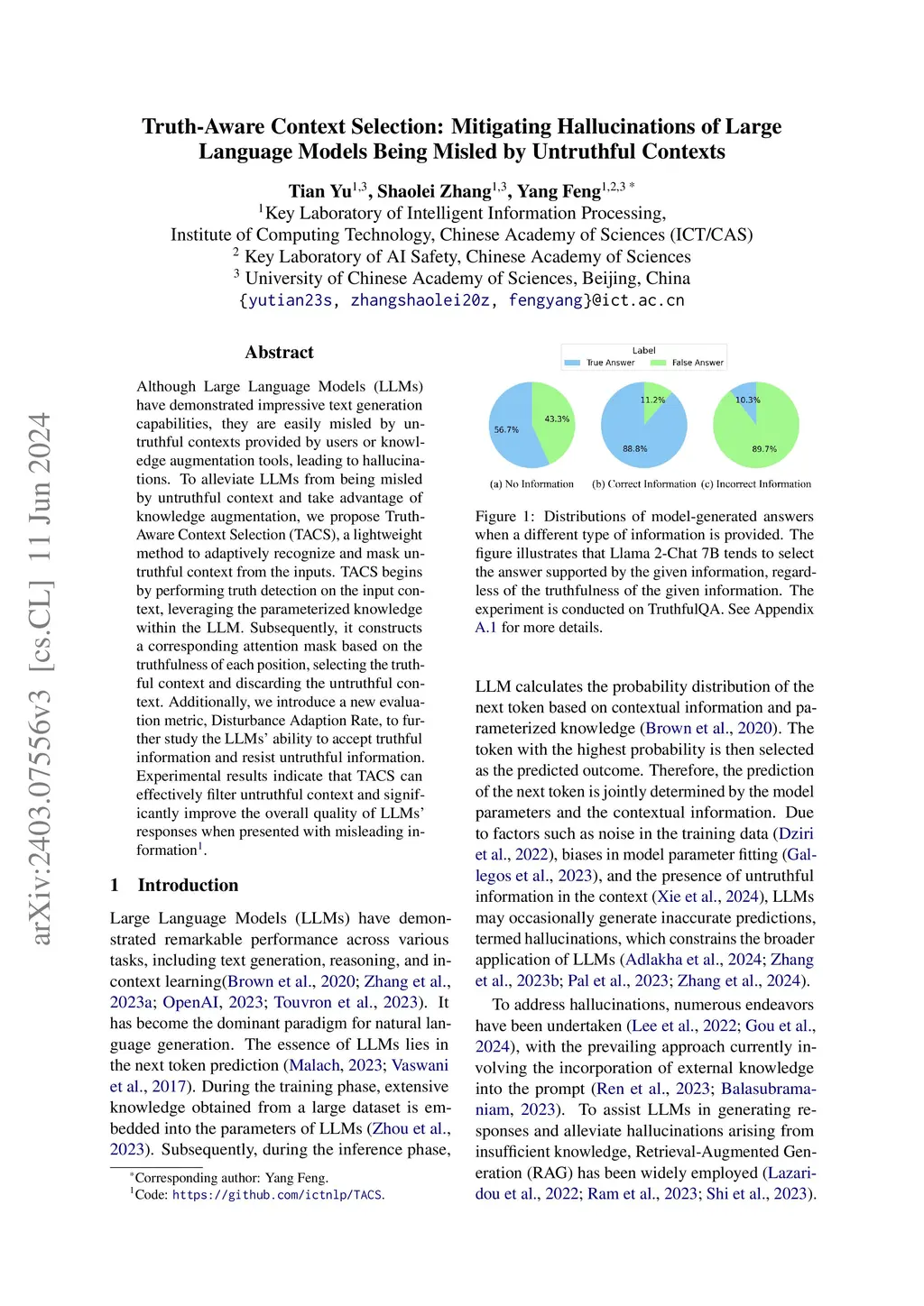 Although Large Language Models (LLMs) have demonstrated impressive text generation capabilities, they are easily misled by untruthful contexts provided by users or knowledge augmentation tools, leading to hallucinations. To alleviate LLMs from being misled by untruthful context and take advantage of knowledge augmentation, we propose Truth-Aware Context Selection (TACS), a lightweight method to adaptively recognize and mask untruthful context from the inputs. TACS begins by performing truth detection on the input context, leveraging the parameterized knowledge within the LLM. Subsequently, it constructs a corresponding attention mask based on the truthfulness of each position, selecting the truthful context and discarding the untruthful context. Additionally, we introduce a new evaluation metric, Disturbance Adaption Rate, to further study the LLMs' ability to accept truthful information and resist untruthful information. Experimental results indicate that TACS can effectively filter untruthful context and significantly improve the overall quality of LLMs' responses when presented with misleading information.
